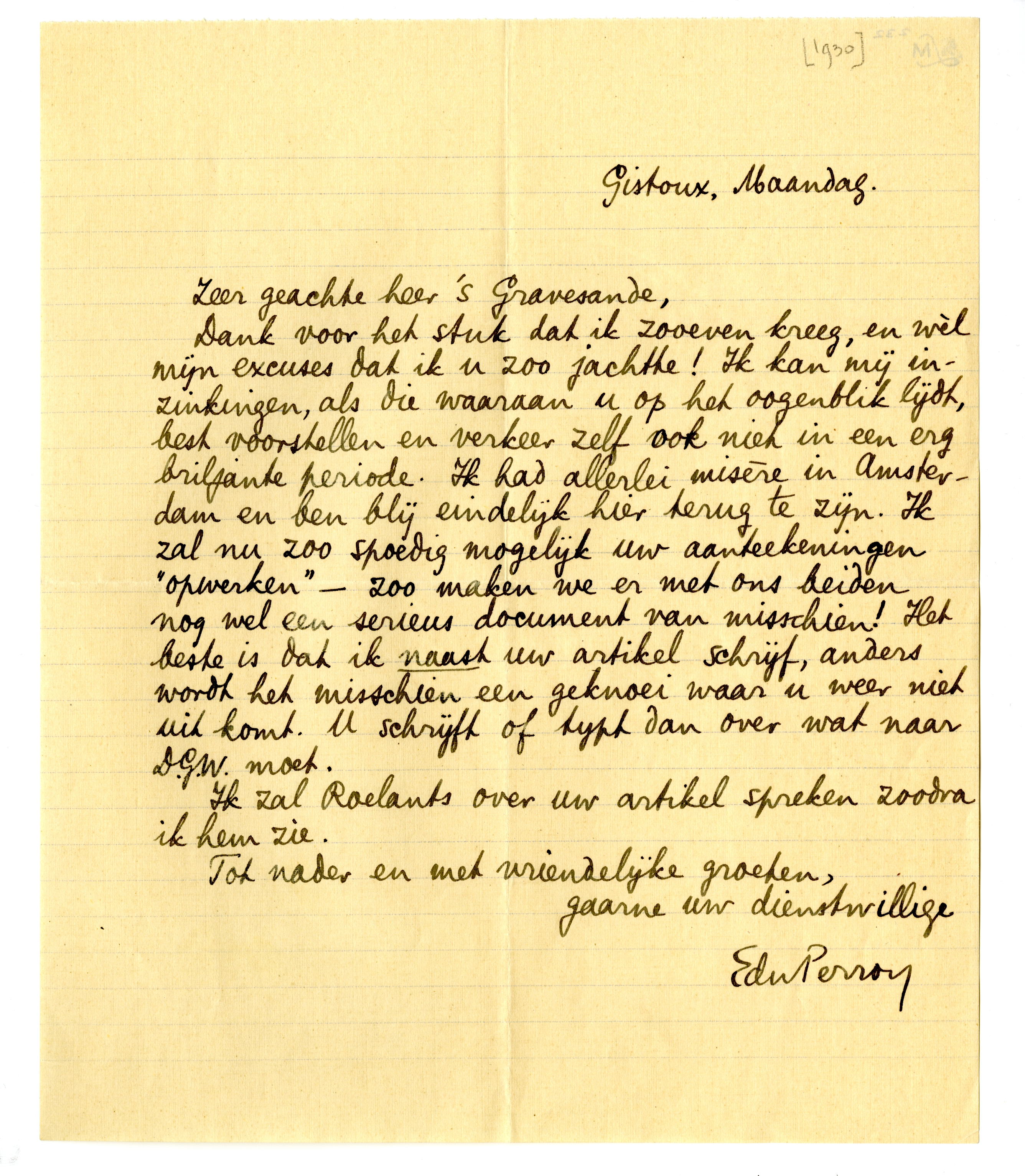 Ik zal Roelants over uw artikel spreken zoodra ik hem zie.