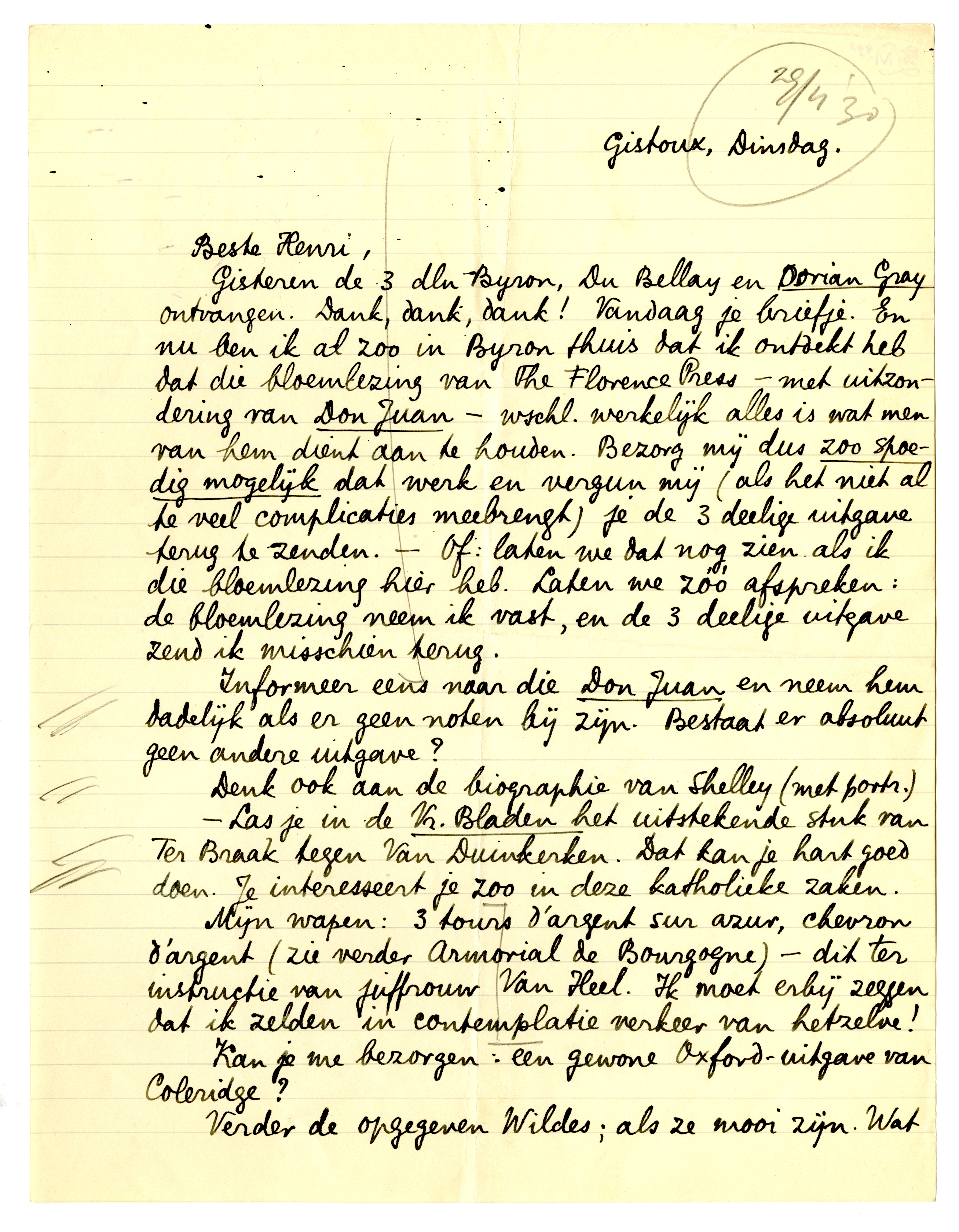 Gisteren de 3 dln Byron, Du Bellay en Dorian Gray ontvangen. Dank, dank, dank! Vandaag je briefje. En nu ben ik al zoo in Byron thuis dat ik ontdekt heb dat die bloemlezing van The Florence Press1104 - met uitzondering van Don Juan - wschl. werkelijk alles is wat men van hem dient aan te houden. Bezorg mij dus zoo spoedig mogelijk dat werk en vergun mij (als het niet al te veel complicaties meebrengt) je de 3 deelige uitgave terug te zenden. - Of: laten we dat nog zien als ik die bloemlezing hier heb. Laten we zóó afspreken: de bloemlezing neem ik vast, en de 3 deelige uitgave zend ik misschien terug.