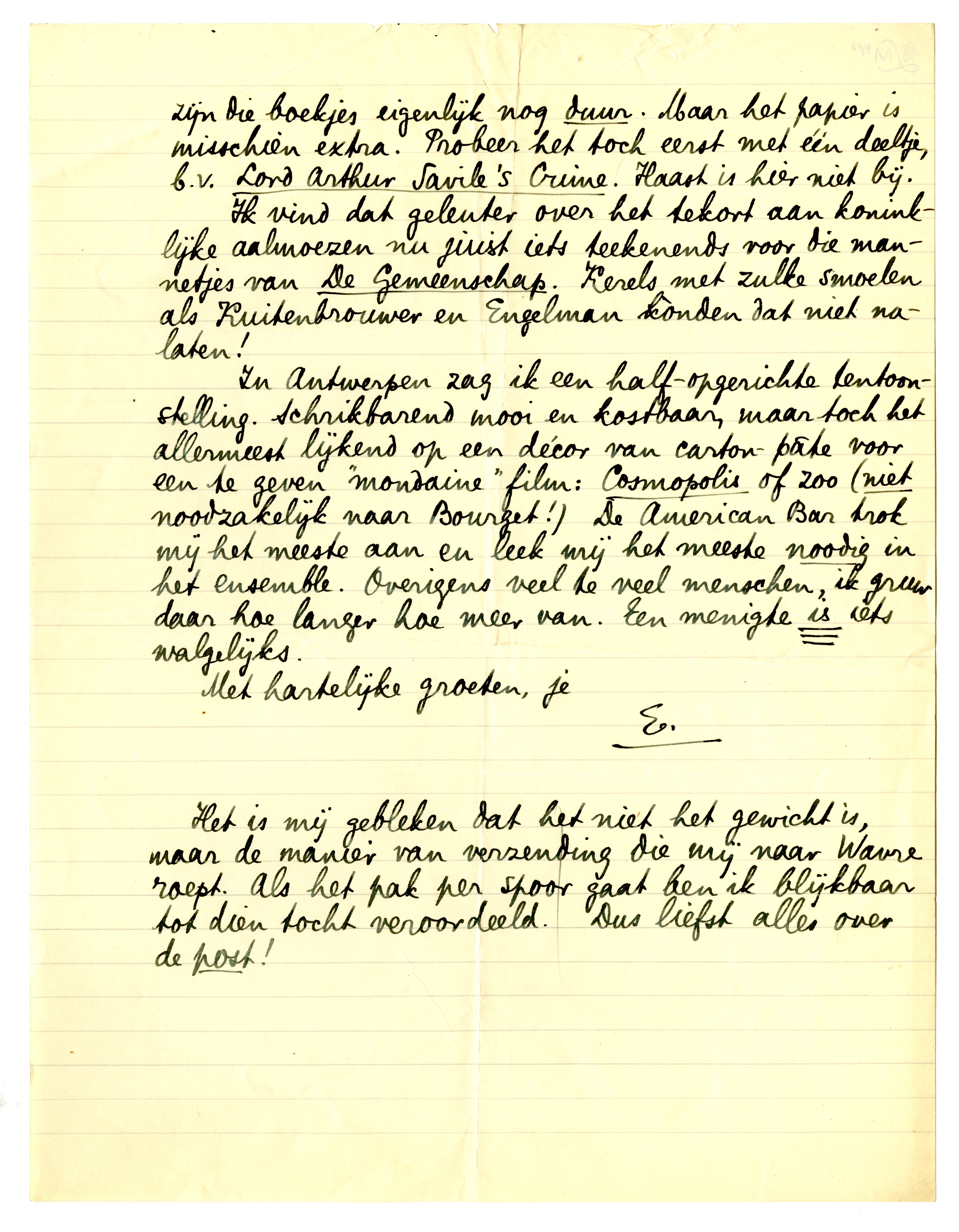 In Antwerpen zag ik een half-opgerichte tentoonstelling. Schrikbarend mooi en kostbaar, maar toch het allermeest lijkend op een décor van carton-pâte voor een te geven ‘mondaine’ film: Cosmopolis1109 of zoo (niet noodzakelijk naar Bourget!) De Americain Bar trok mij het meeste aan en leek mij het meeste noodig in het ensemble. Overigens veel te veel menschen, ik gruw daar hoe langer hoe meer van. Een menigte is1110 iets walgelijks.
