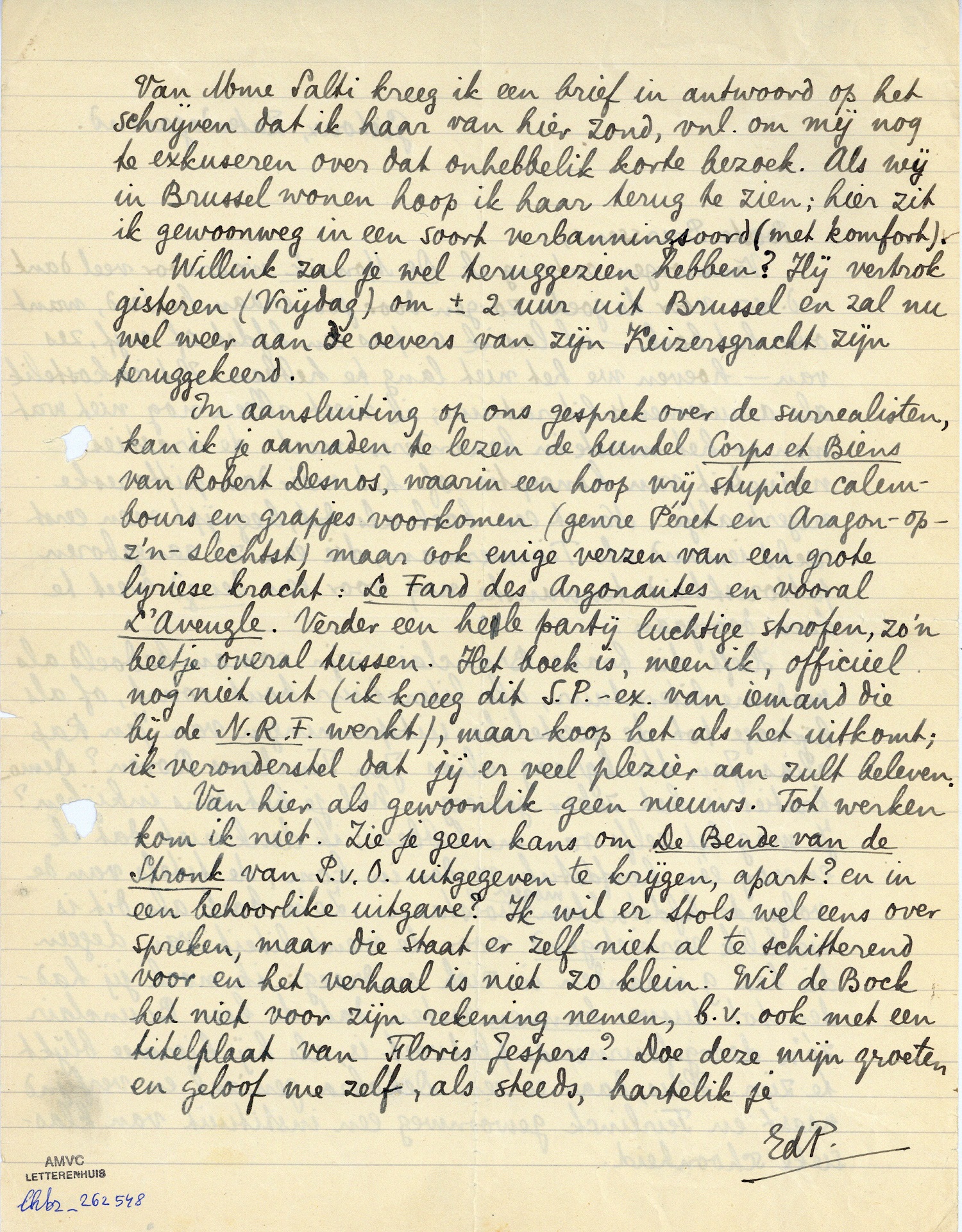 Van Mme Salti kreeg ik een brief in antwoord op het schrijven dat ik haar van hier zond, vnl. om mij nog te exkuseren over dat onhebbelik korte bezoek. Als wij in Brussel wonen hoop ik haar terug te zien; hier zit ik gewoonweg in een soort verbanningsoord (met komfort).