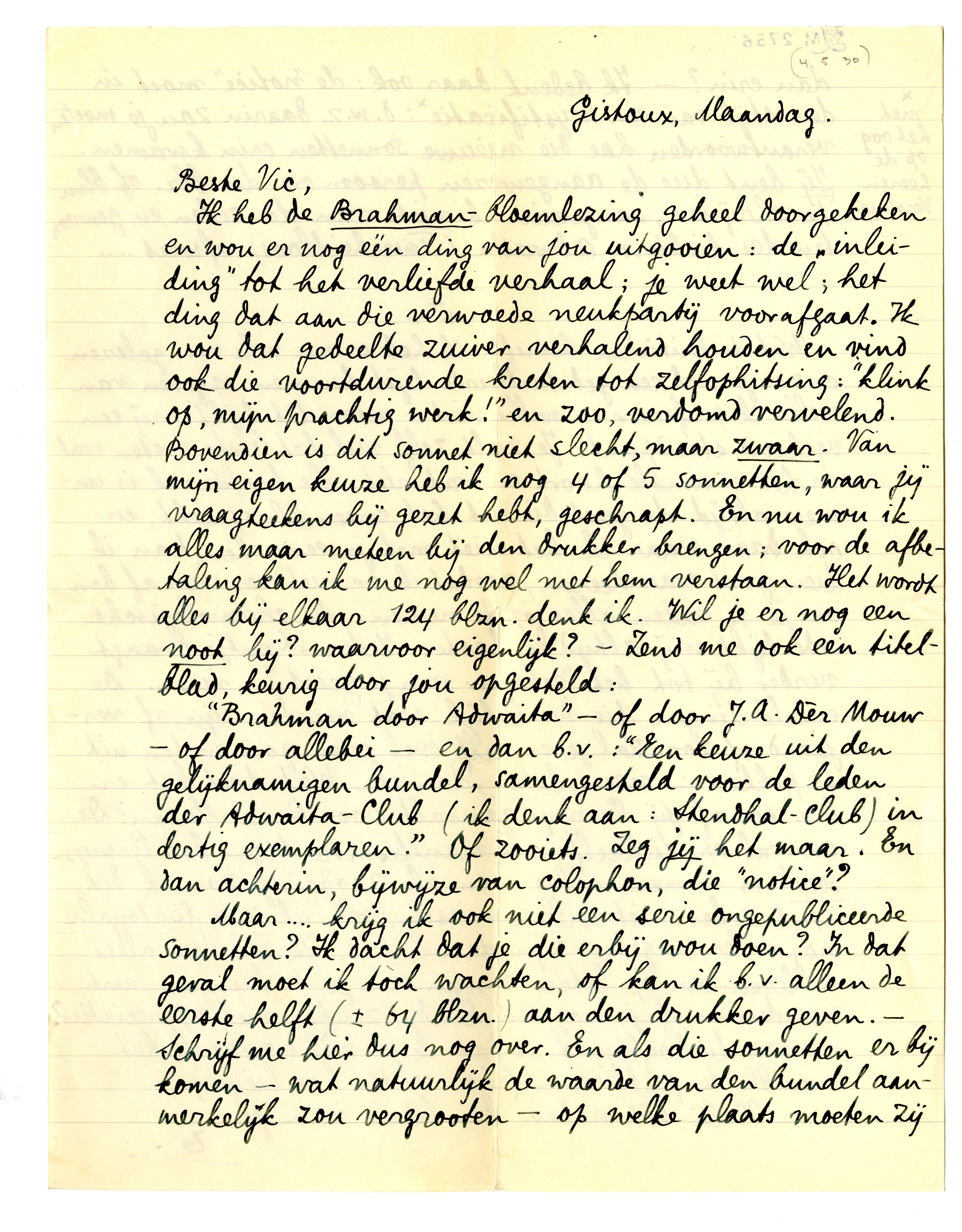 Maar.... krijg ik ook niet een serie ongepubliceerde sonnetten? Ik dacht dat je die erbij wou doen? In dat geval moet ik tòch wachten, of kan ik b.v. alleen de eerste helft (± 64 blzn.) aan den drukker geven. - Schrijf me hier dus nog over. En als die sonnetten er bij komen - wat natuurlijk de waarde van den bundel aanmerkelijk zou vergrooten - op welke plaats moeten zij dan erin? - Ik bedenk daar ook: de ‘notice’ moet in den stijl van een mystificatie*: d.w.z. daarin zou je moeten verantwoorden hoe die nieuwe sonnetten erin kwamen. Jij bent dus de aangewezen persoon om die blz. of blzn. te schrijven, aangezien ik niets van de zeden en gewoonten des dichters Adwaita (Tweeheidloos) afweet....