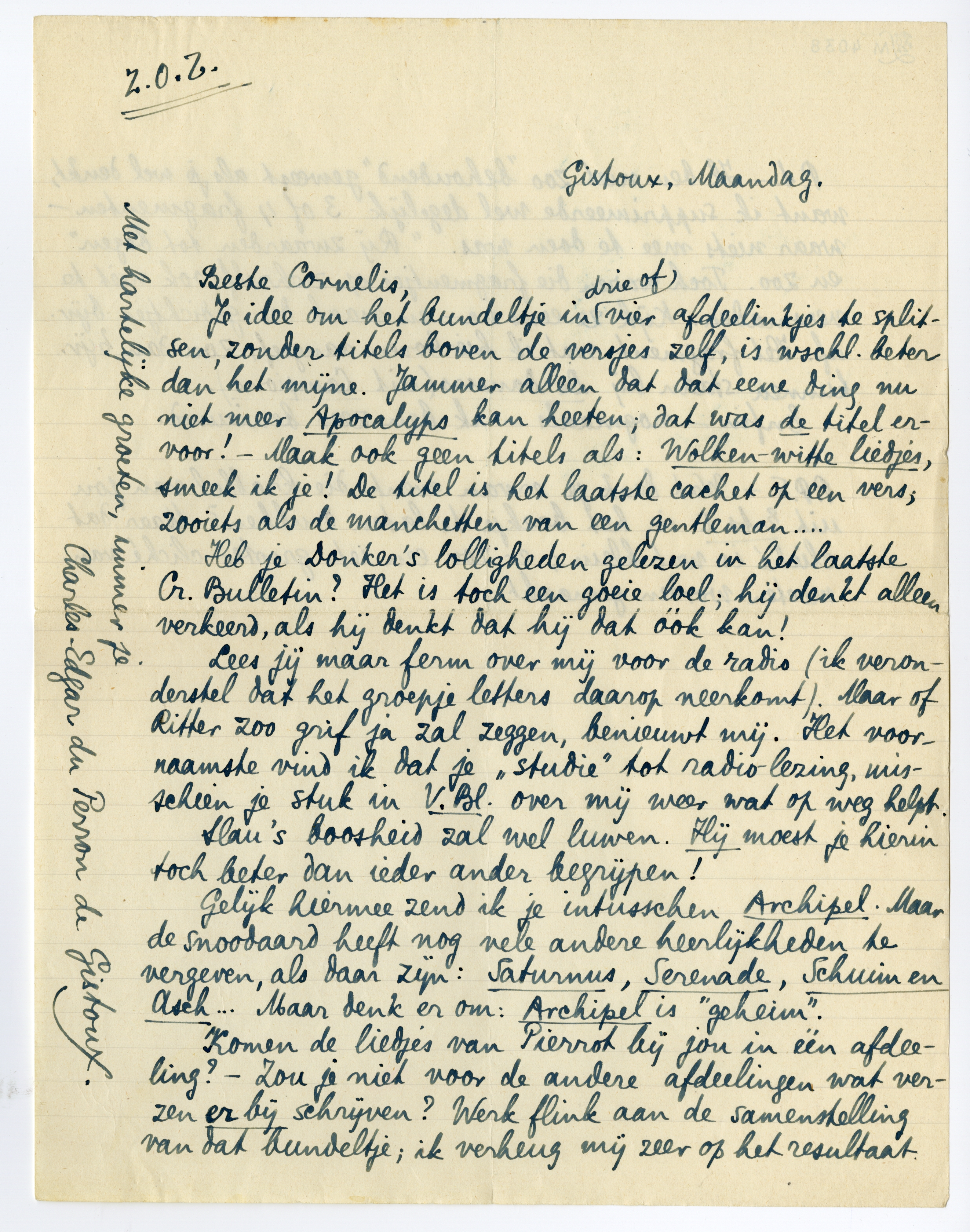 Gelijk hiermee zend ik je intusschen Archipel. Maar de snoodaard heeft nog vele andere heerlijkheden te vergeven, als daar zijn: Saturnus, Serenade, Schuim en Asch... Maar denk er om: Archipel is ‘geheim’.