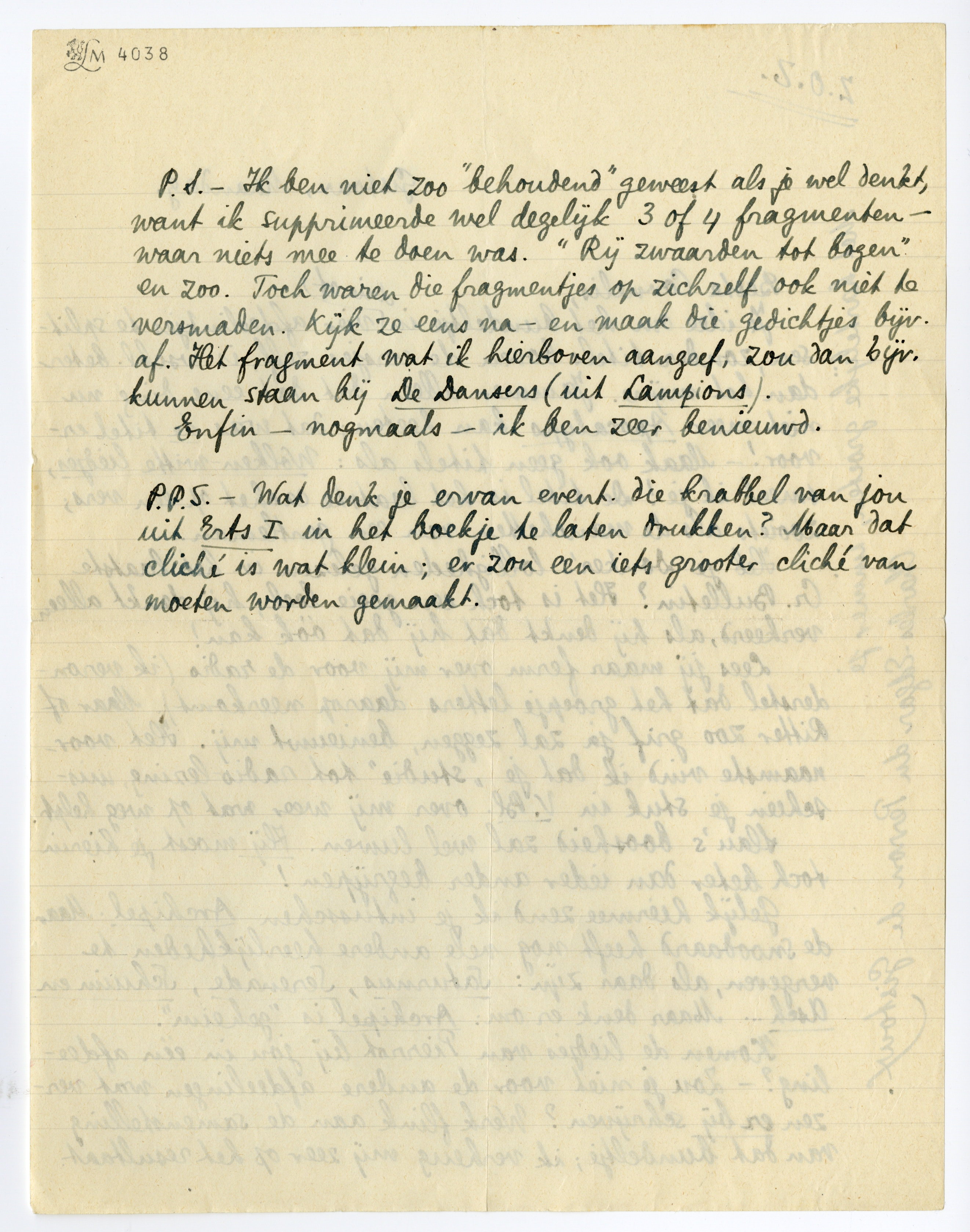 P.P.S. - Wat denk je ervan event, die krabbel van jou uit Erts I in het boekje te laten drukken? Maar dat cliché is wat klein; er zou een iets grooter cliché van moeten worden gemaakt.