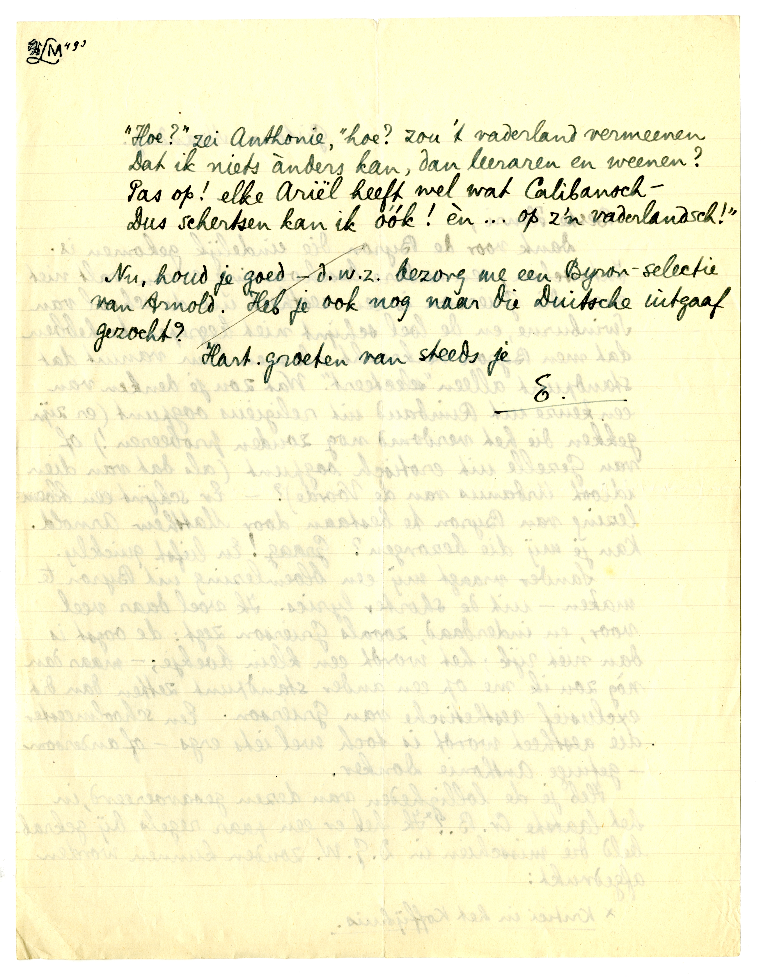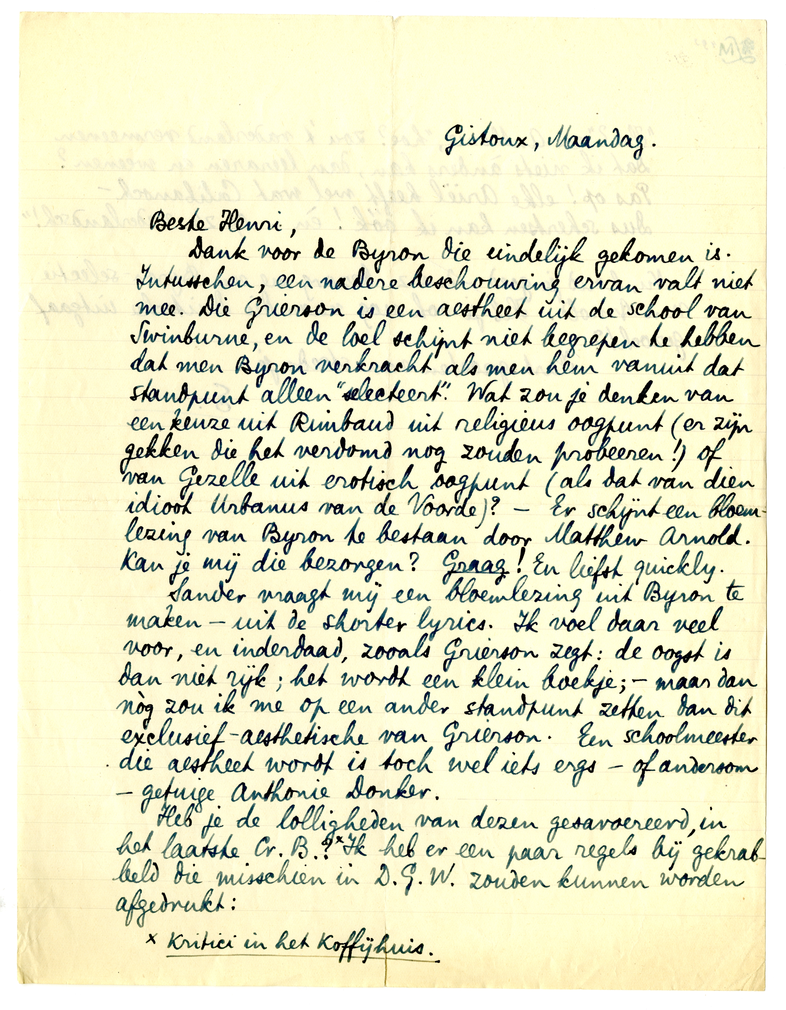 Sander vraagt mij een bloemlezing uit Byron te maken - uit de shorter lyrics.1131Ik voel daar veel voor, en inderdaad, zooals Grierson zegt: de oogst is dan niet rijk; het wordt een klein boekje; - maar dan nòg zou ik me op een ander standpunt zetten dan dit exclusief-aesthetische van Grierson. Een schoolmeester die aestheet wordt is toch wel iets ergs - of andersom - getuige Anthonie Donker.