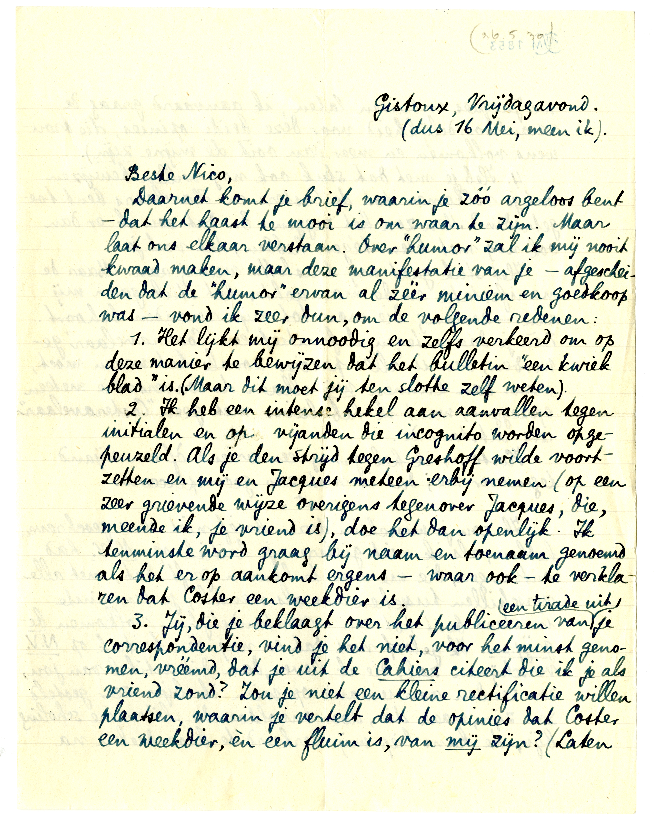 Daarnet komt je brief, waarin je zóó argeloos bent - dat het haast te mooi is om waar te zijn. Maar laat ons elkaar verstaan. Over ‘humor’ zal ik mij nooit kwaad maken, maar deze manifestatie van je - afgescheiden dat de ‘humor’ ervan al zéér miniem en goedkoop was - vond ik zeer dun, om de volgende redenen: