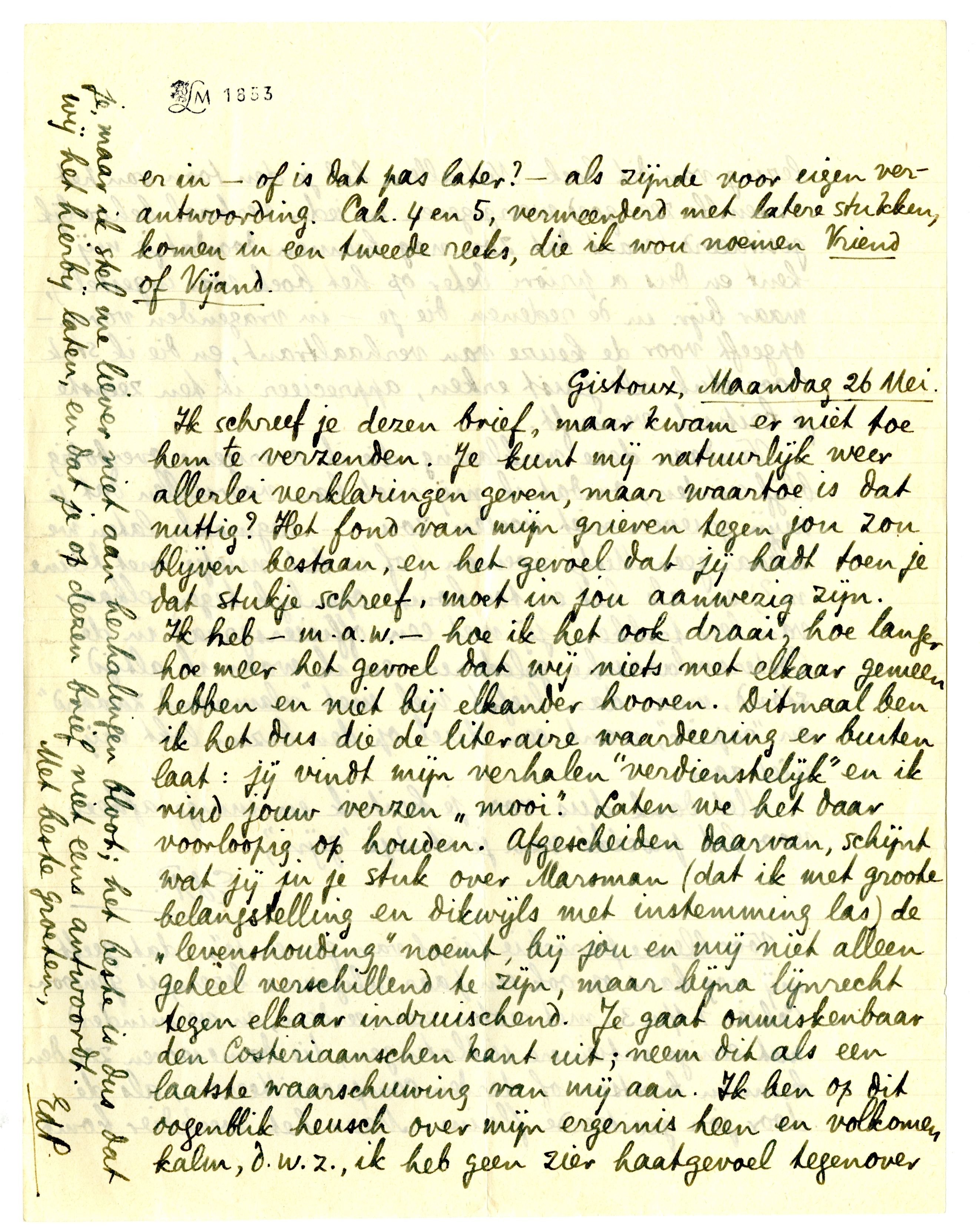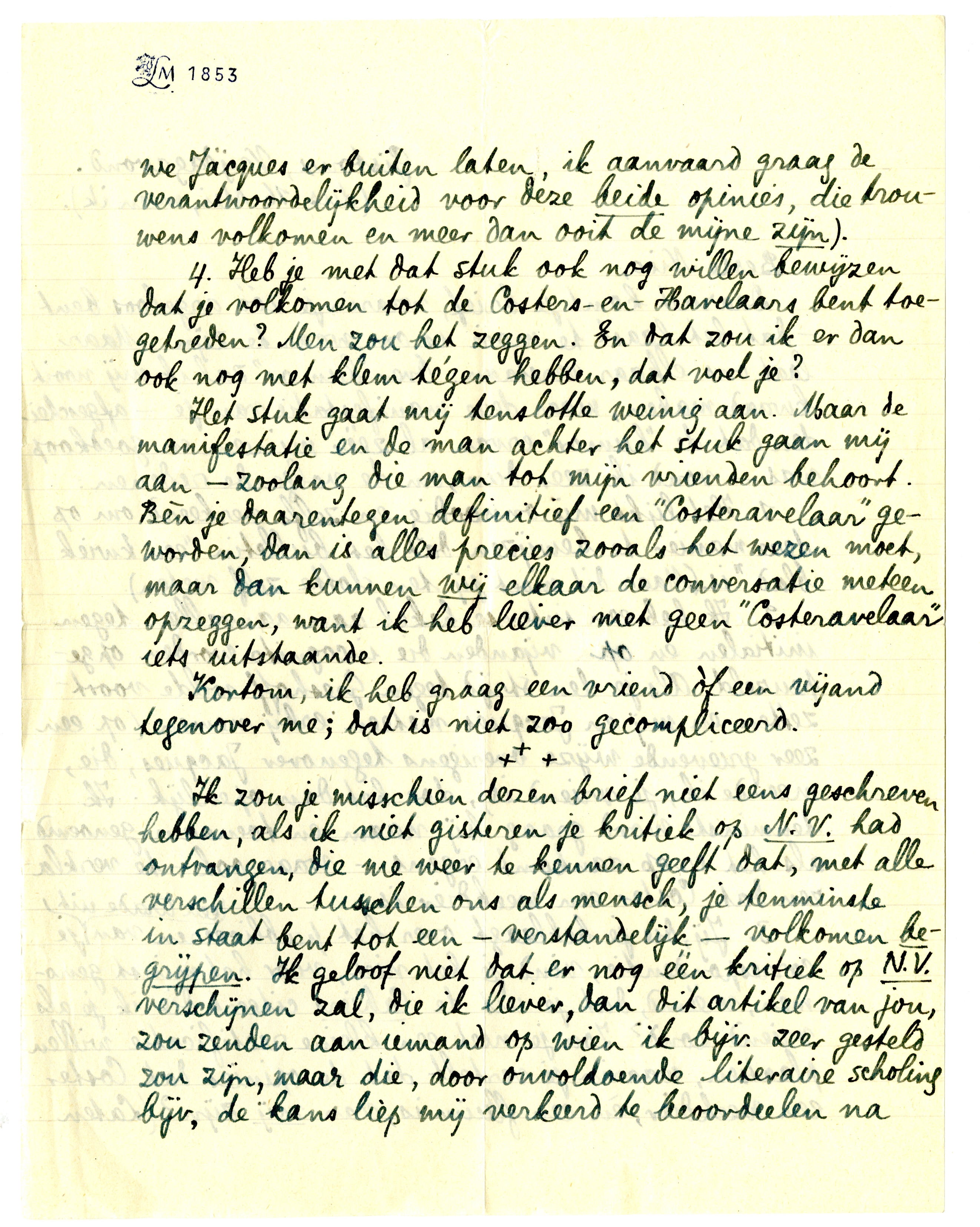 Ik schreef je dezen brief, maar kwam er niet toe hem te verzenden. Je kunt mij natuurlijk weer allerlei verklaringen geven, maar waartoe is dat nuttig? Het fond van mijn grieven tegen jou zou blijven bestaan, en het gevoel dat jij hadt toen je dat stukje schreef, moet in jou aanwezig zijn. Ik heb - m.a.w. - hoe ik het ook draai, hoe langer hoe meer het gevoel dat wij niets met elkaar gemeen hebben en niet bij elkander hooren. Ditmaal ben ik het dus die de literaire waardeering er buiten laat: jij vindt mijn verhalen ‘verdienstelijk’ en ik vind jouw verzen ‘mooi’. Laten we het daar voorloopig op houden. Afgescheiden daarvan, schijnt wat jij in je stuk over Marsman1135 (dat ik met groote belangstelling en dikwijls met instemming las) de ‘levenshouding’ noemt, bij jou en mij niet alleen geheel verschillend te zijn, maar bijna lijnrecht tegen elkaar indruischend. Je gaat onmiskenbaar den Costeriaanschen kant uit; neem dit als een laatste waarschuwing van mij aan. Ik ben op dit oogenblik heusch over mijn ergernis heen en volkomen kalm, d.w.z. ik heb geen zier haatgevoel tegenover je, maar ik stel me liever niet aan herhalingen bloot; het beste is dus dat wij het hierbij laten, en dat je op dezen brief niet eens antwoordt.