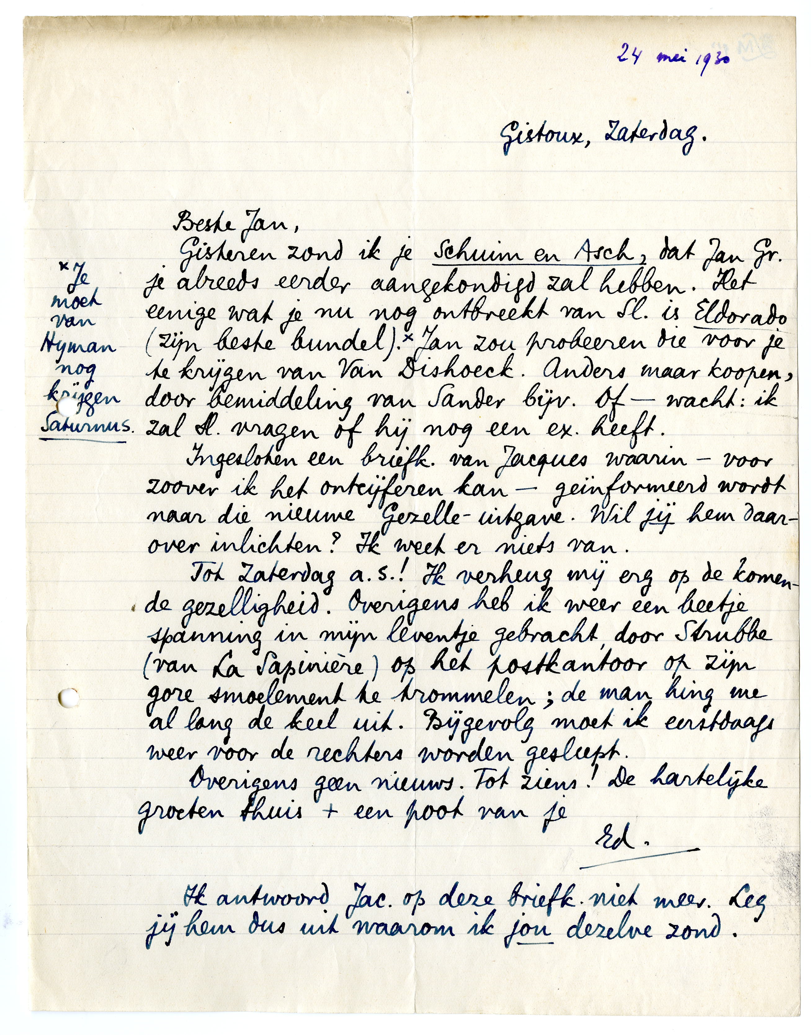 Gisteren zond ik je Schuim en Asch, dat Jan Gr. je alreeds eerder aangekondigd zal hebben. Het eenige wat je nu nog ontbreekt van Sl. is Eldorado (zijn beste bundel).* Jan zou probeeren die voor je te krijgen van Van Dishoeck. Anders maar koopen, door bemiddeling van Sander bijv. Of - wacht: ik zal Sl. vragen of hij nog een ex. heeft.