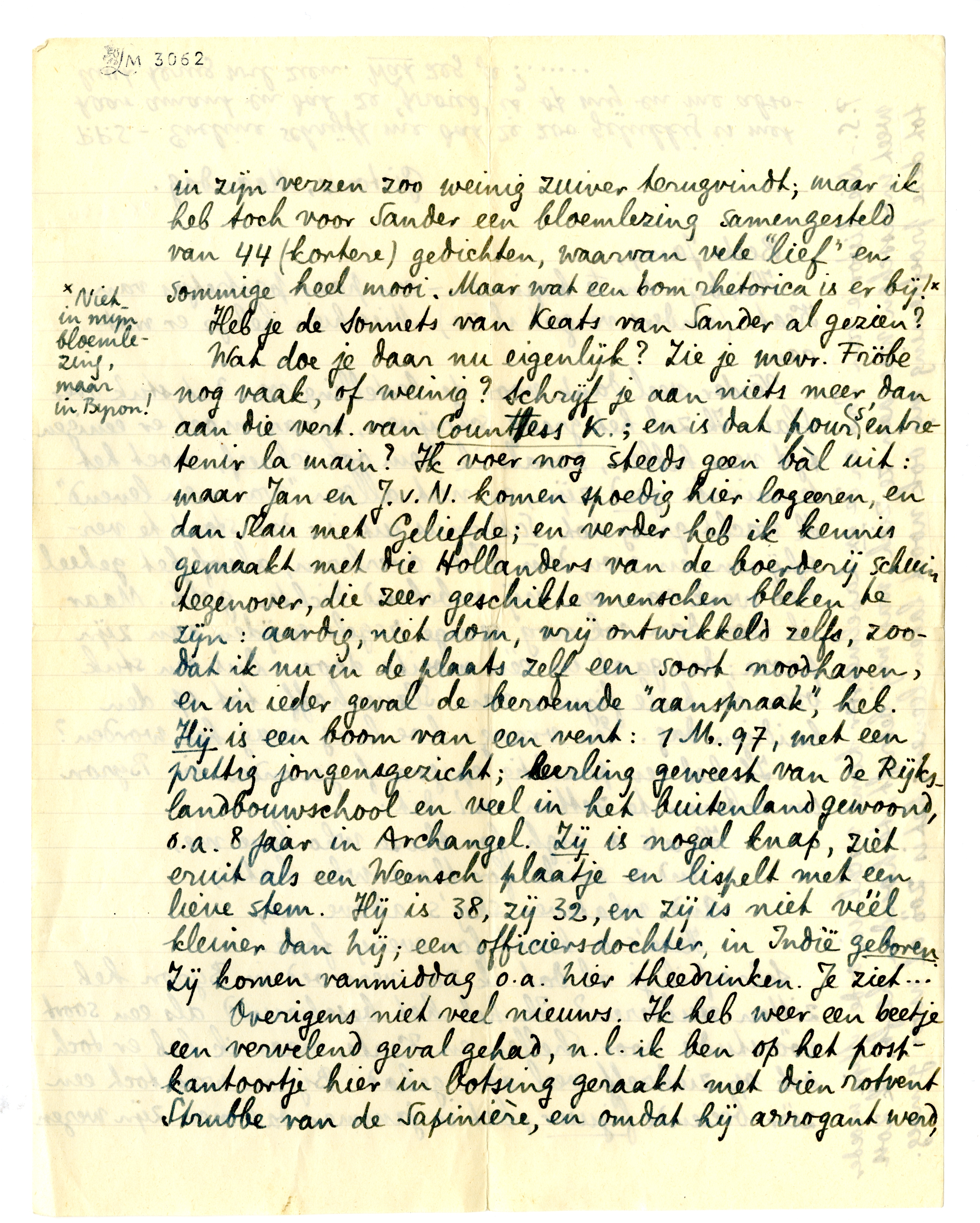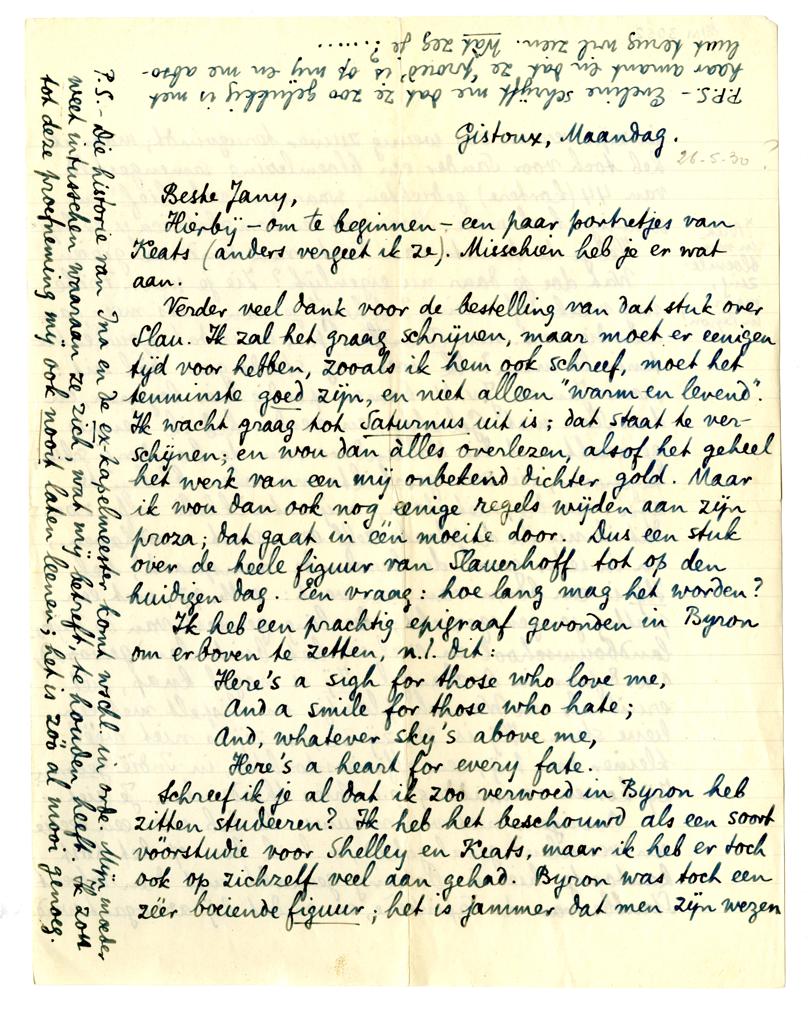 Schreef ik je al dat ik zoo verwoed in Byron heb zitten studeeren? Ik heb het beschouwd als een soort vóórstudie voor Shelley en Keats, maar ik heb er toch ook op zichzelf veel aan gehad. Byron was toch een zéér boeiende figuur; het is jammer dat men zijn wezen in zijn verzen zoo weinig zuiver terugvindt; maar ik heb toch voor Sander een bloemlezing samengesteld van 44 (kortere) gedichten, waarvan vele ‘lief’ en sommige heel mooi. Maar wat een bom rhetorica is er bij!*