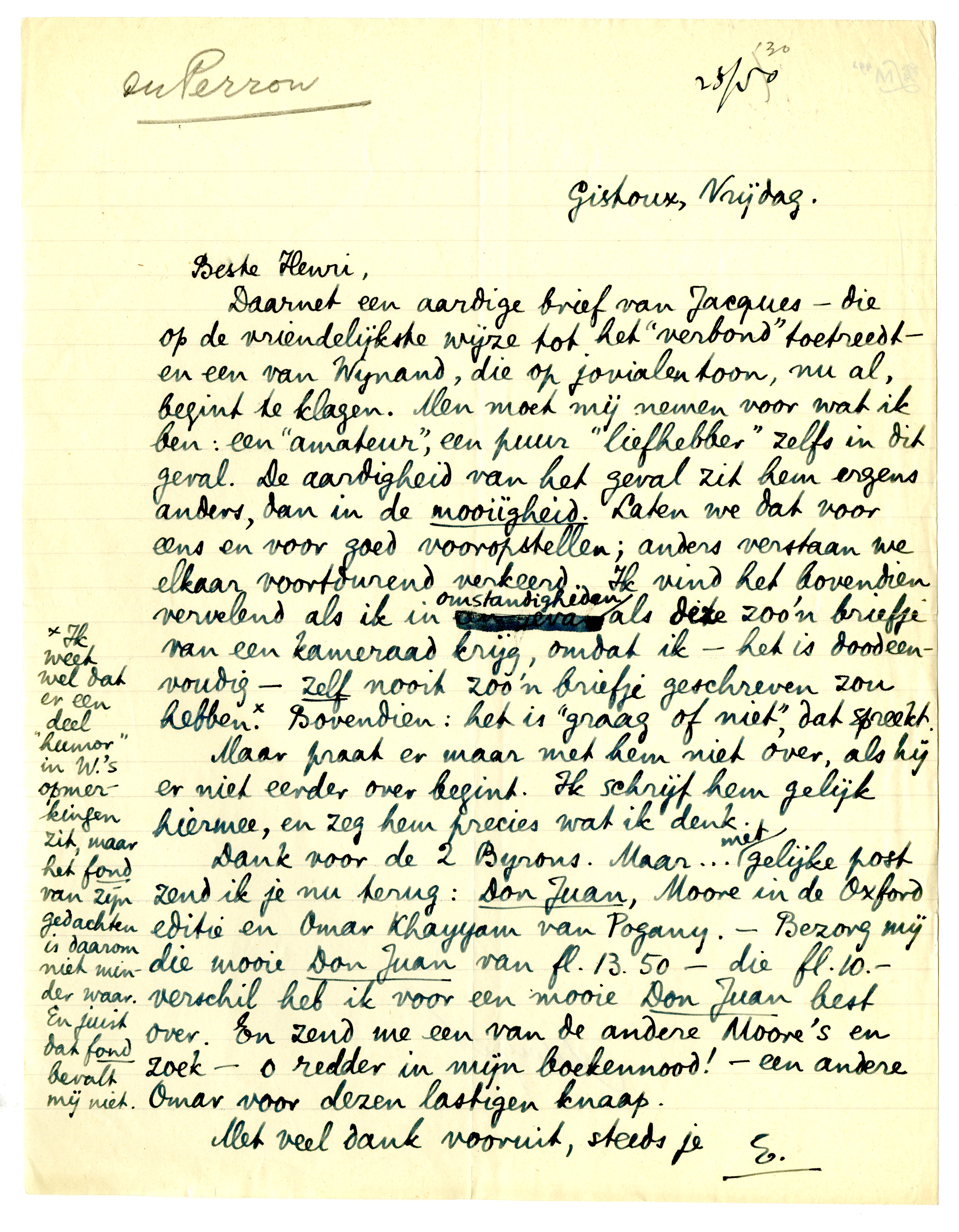Dank voor de 2 Byrons. Maar... met gelijke post zend ik je nu terug: Don Juan, Moore in de Oxford editie en Omar Khayyam van Pogany. - Bezorg mij die mooie Don Juan van fl.13.50- die fl.10.- verschil heb ik voor een mooie Don Juan best over. En zend me een van de andere Moore's en zoek - o redder in mijn boekennood! - een andere Omar voor dezen lastigen knaap.