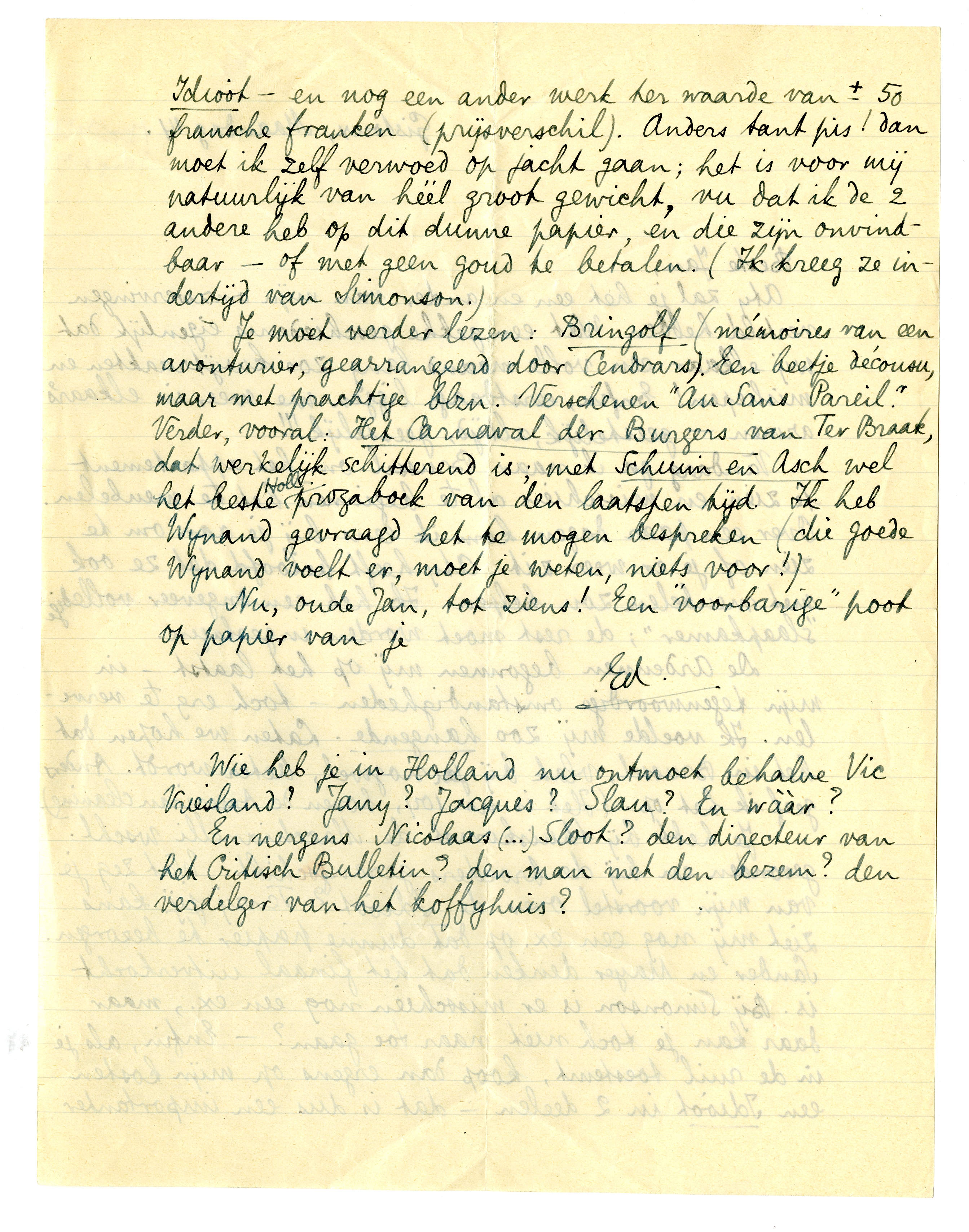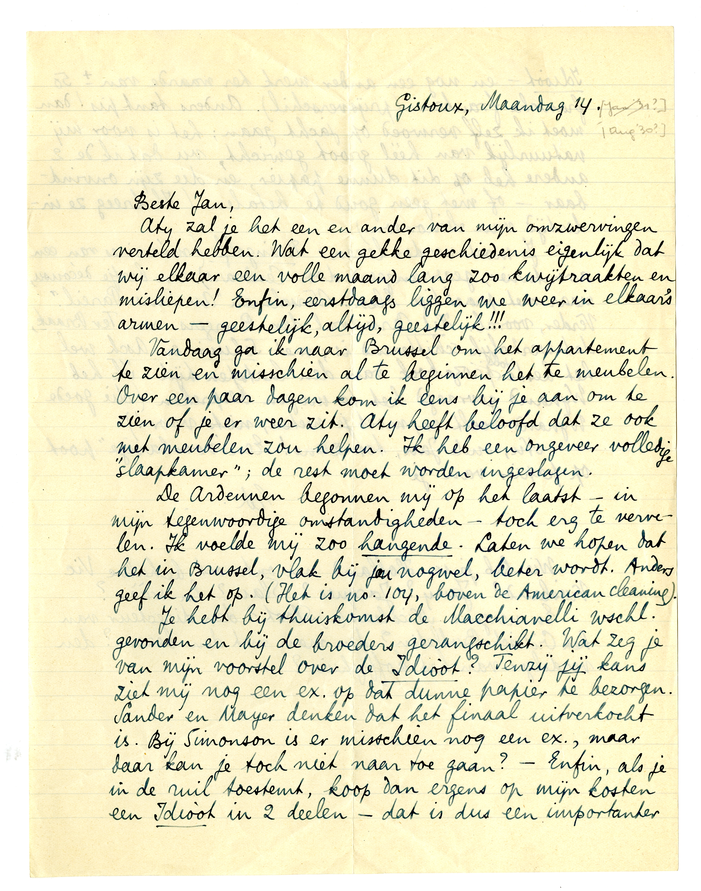 Je hebt bij thuiskomst de Macchiavelli wschl. gevonden en bij de broeders gerangschikt. Wat zeg je van mijn voorstel over de Idioot? Tenzij jij kans ziet mij nog een ex. op dat dunne papier te bezorgen. Sander en Mayer denken dat het finaal uitverkocht is. Bij Simonson is er misschien nog een ex., maar daar kan je toch niet naar toe gaan? - Enfin, als je in de ruil toestemt, koop dan ergens op mijn kosten een Idioot in 2 deelen - dat is dus een importanter Idioot - en nog een ander werk ter waarde van ± 50 fransche franken (prijsverschil). Anders tant pis! dan moet ik zelf verwoed op jacht gaan; het is voor mij natuurlijk van héél groot gewicht, nu dat ik de 2 andere heb op dit dunne papier, en die zijn onvindbaar - of met geen goud te betalen. (Ik kreeg ze indertijd van Simonson.)
