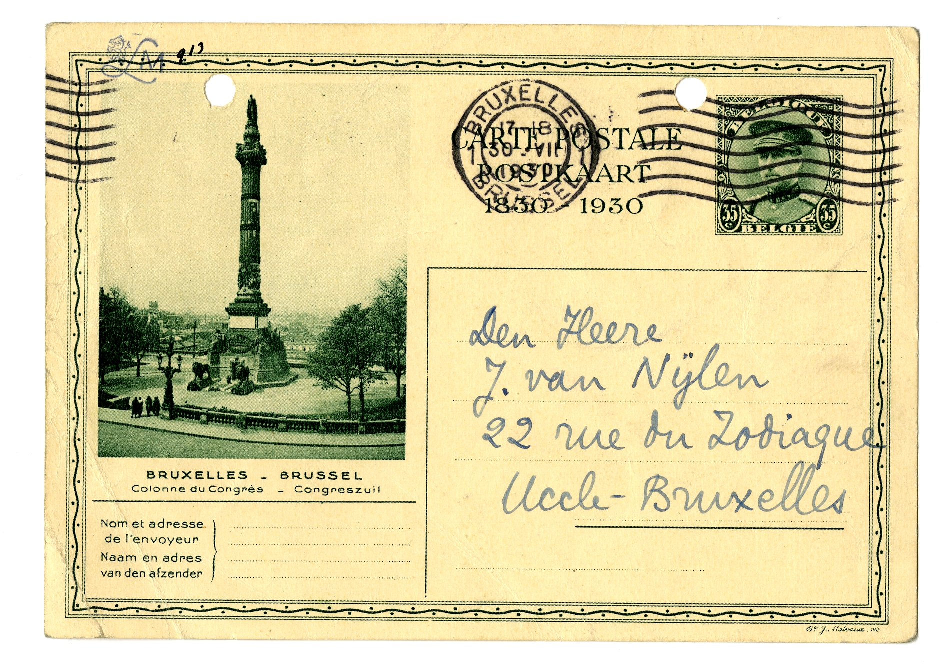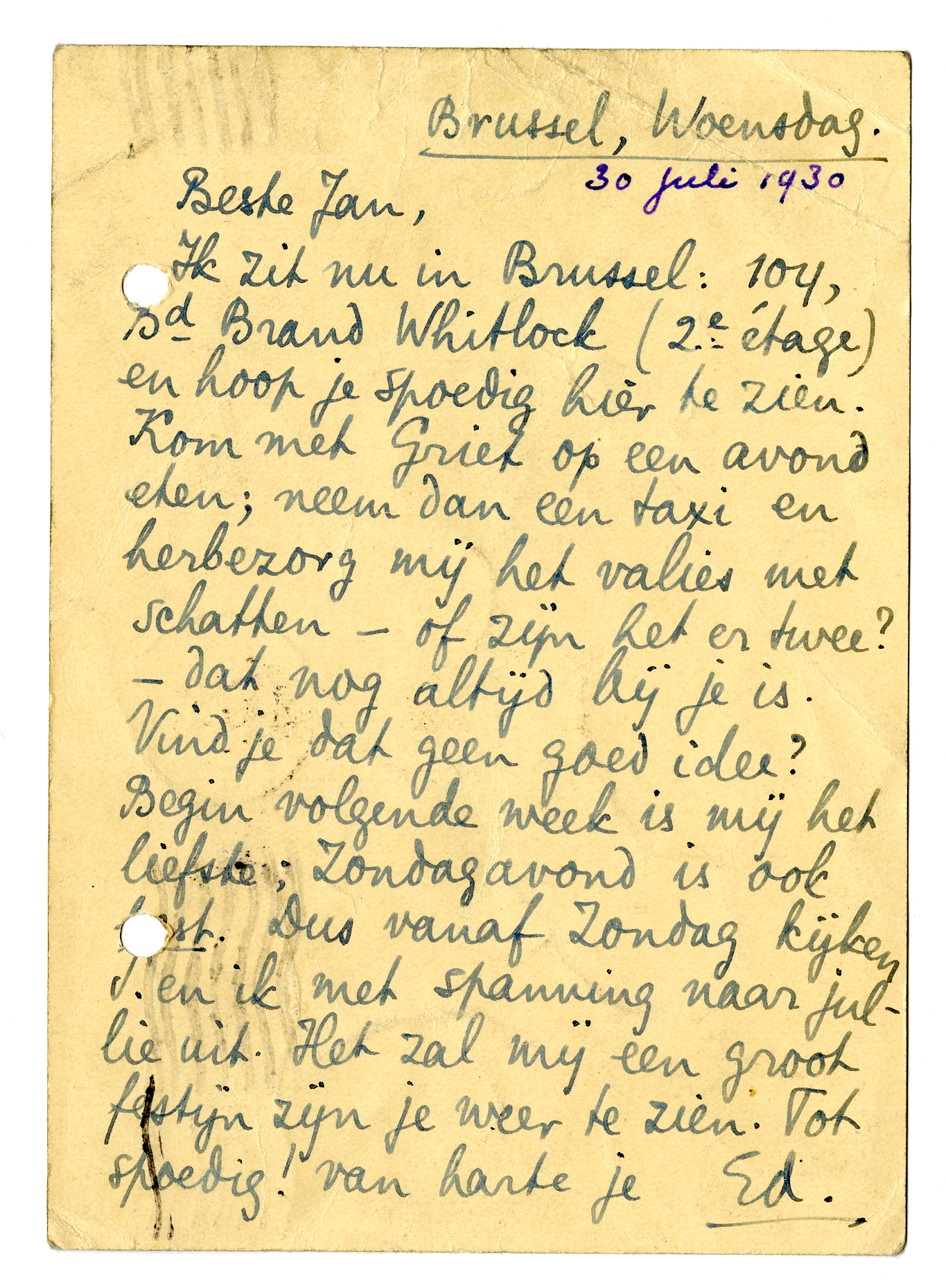 Ik zit nu in Brussel: 104, Bd Brand Whitlock (2e étage) en hoop je spoedig hier te zien. Kom met Griet op een avond eten; neem dan een taxi en herbezorg mij het valies met schatten - of zijn het er twee? - dat nog altijd bij je is. Vind je dat geen goed idee? Begin volgende week is mij het liefste; Zondagavond is ook best. Dus vanaf Zondag kijken S. en ik met spanning naar jullie uit. Het zal mij een groot festijn zijn je weer te zien. Tot spoedig! van harte je