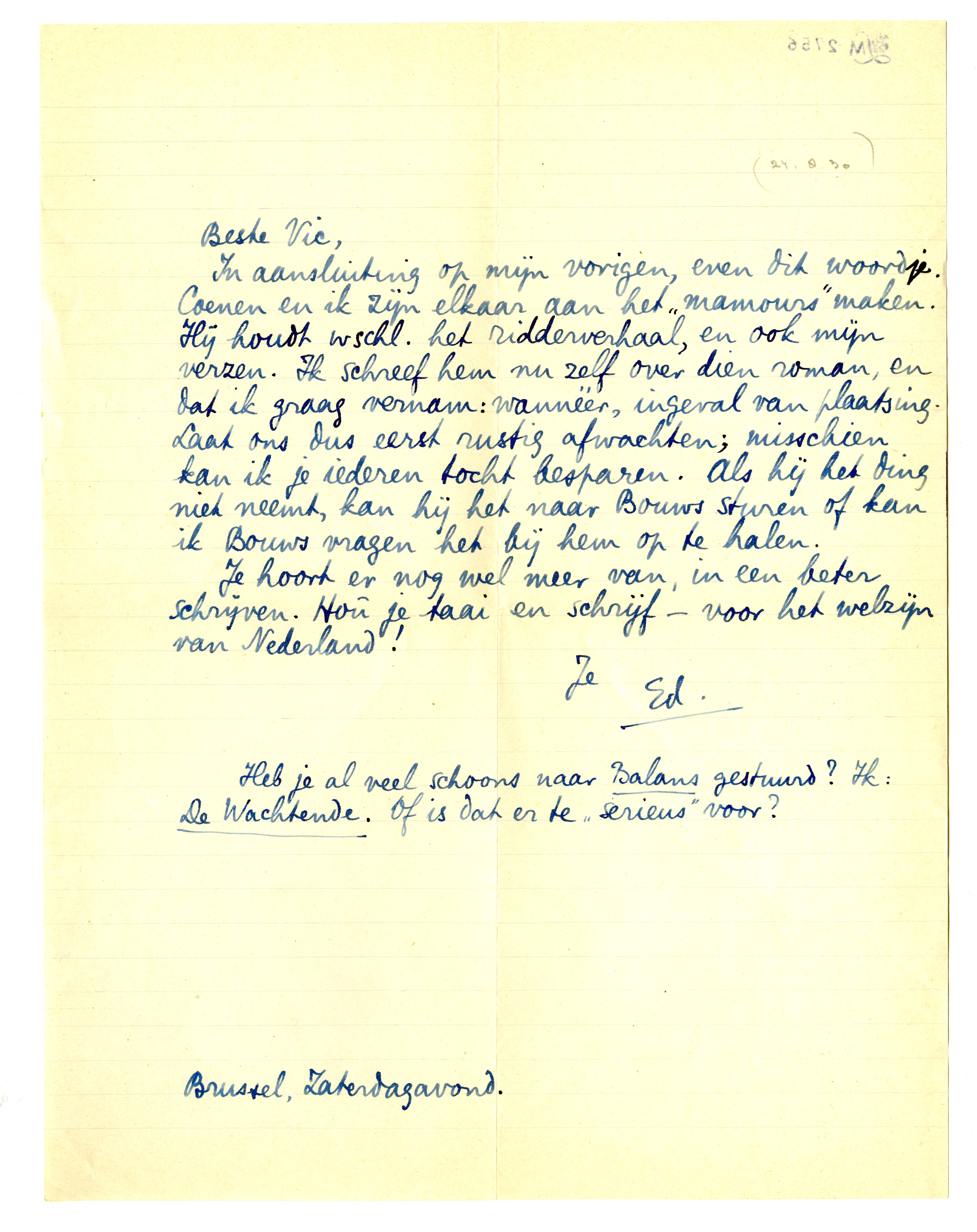 In aansluiting op mijn vorigen, even dit woordje. Coenen en ik zijn elkaar aan het ‘mamours’ maken. Hij houdt wschl. het ridderverhaal, en ook mijn verzen. Ik schreef hem nu zelf over dien roman, en dat ik graag vernam: wannéér, ingeval van plaatsing. Laat ons dus eerst rustig afwachten; misschien kan ik je iederen tocht besparen. Als hij het ding niet neemt, kan hij het naar Bouws sturen of kan ik Bouws vragen het bij hem op te halen.