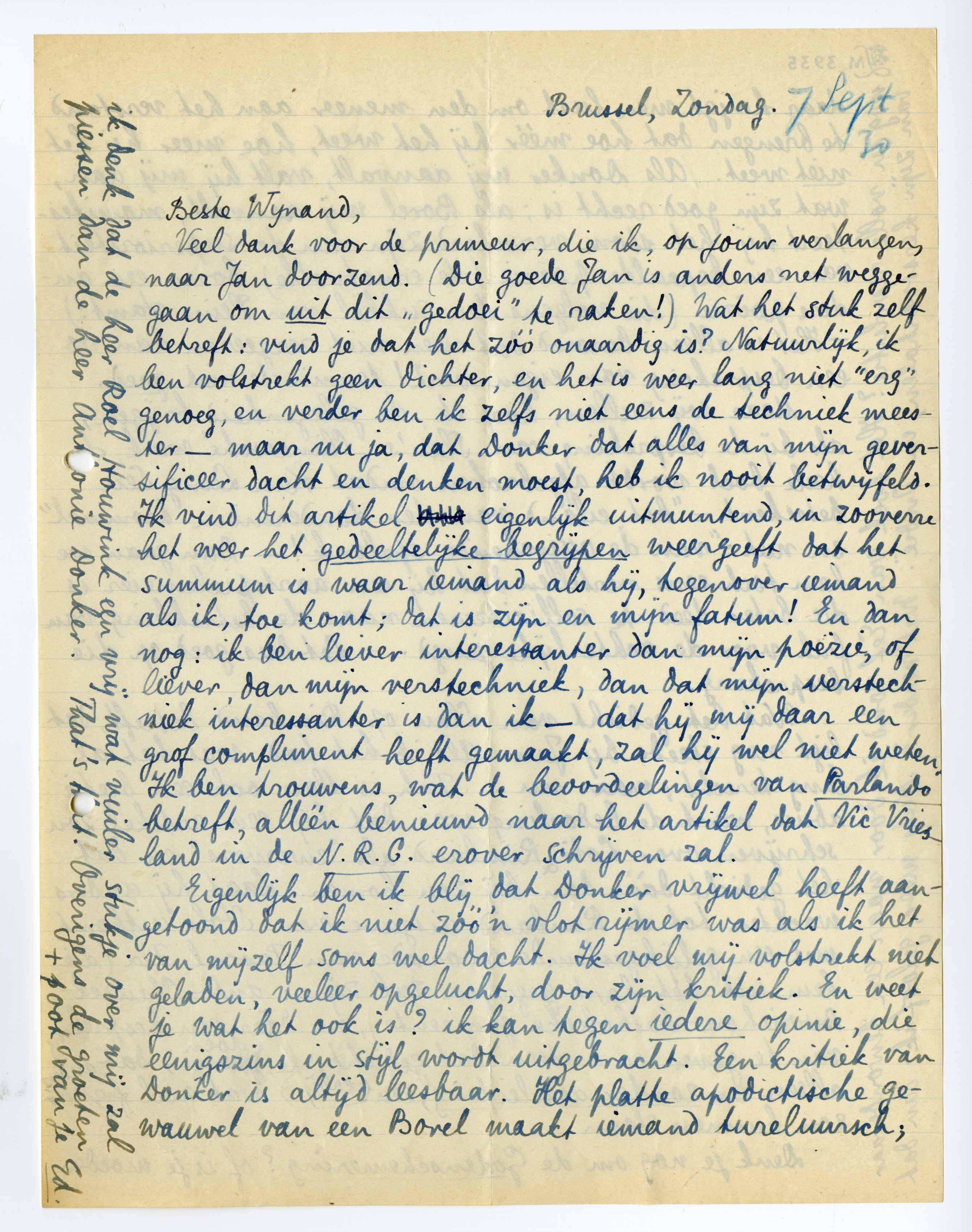 Eigenlijk ben ik blij dat Donker vrijwel heeft aangetoond dat ik niet zóó'n vlot rijmer was als ik het van mijzelf soms wel dacht. Ik voel mij volstrekt niet geladen, veeleer opgelucht, door zijn kritiek. En weet je wat het ook is? ik kan tegen iedere opinie, die eenigszins in stijl wordt uitgebracht. Een kritiek van Donker is altijd leesbaar. Het platte apodictische gewauwel van een Borel maakt iemand tureluursch; daar krijgt men lust om den meneer aan het verstand te brengen dat hoe méér hij het weet, hoe meer hij het niet weet. Als Donker mij aanvalt, valt hij mij aan, wat zijn goed recht is; als Borel mij aanvalt, manifesteert hij het stom verzekerd-zijn van de superioriteit van een bepaalde poëzie (de ernstvolle) boven een andere poëzie (die volgens den sukkel van Heine stamt!) - Het is alleen beroerd dat men niet reageeren kan op een bespreking van eigen werk! tenminste, niet goed.
