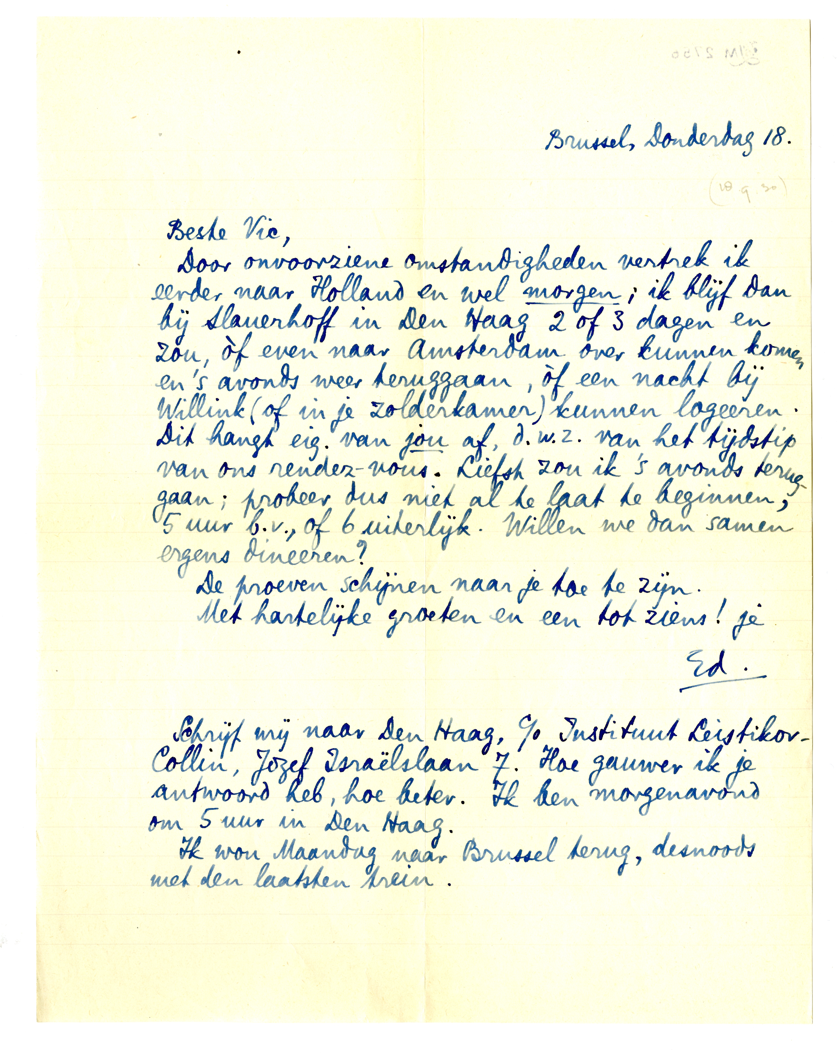 Door onvoorziene omstandigheden vertrek ik eerder naar Holland en wel morgen; ik blijf dan bij Slauerhoffin Den Haag 2 of 3 dagen en zou, òf even naar Amsterdam over kunnen komen en 's avonds weer teruggaan, òf een nacht bij Willink (of in je zolderkamer) kunnen logeeren. Dit hangt eig. van jou af, d.w.z. van het tijdstip van ons rendez-vous. Liefst zou ik 's avonds teruggaan; probeer dus niet al te laat te beginnen, 5 uur b.v., of 6 uiterlijk. Willen we dan samen ergens dineeren?