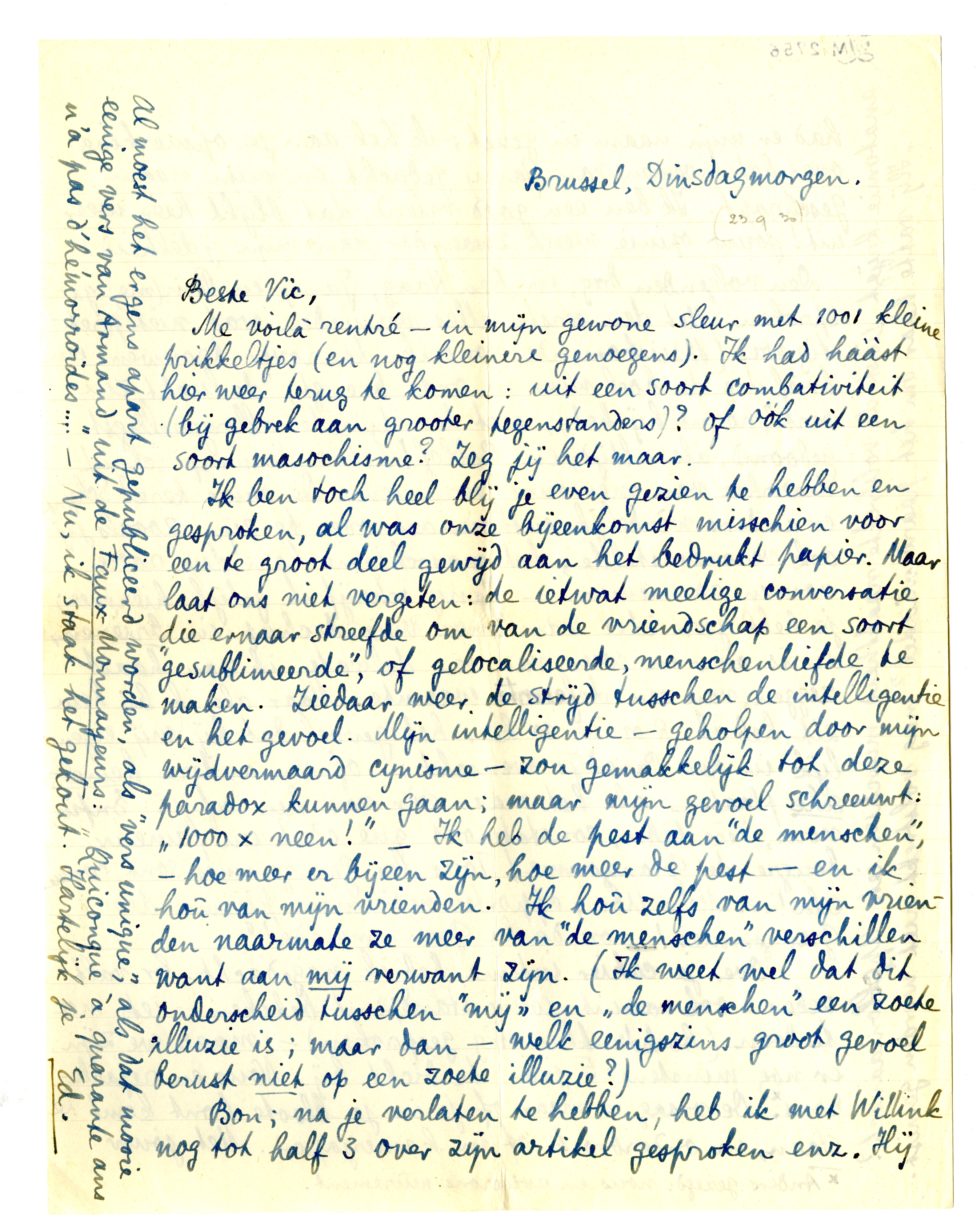 Ik ben toch heel blij je even gezien te hebben en gesproken, al was onze bijeenkomst misschien voor een te groot deel gewijd aan het bedrukt papier. Maar laat ons niet vergeten: de ietwat meelige conversatie die ernaar streefde om van de vriendschap een soort ‘gesublimeerde’, of gelocaliseerde, menschenliefde te maken. Ziedaar weer de strijd tusschen de intelligentie en het gevoel. Mijn intelligentie - geholpen door mijn wijdvermaard cynisme - zou gemakkelijk tot deze paradox kunnen gaan; maar mijn gevoel schreeuwt: ‘1000 × neen!’ - Ik heb de pest aan ‘de menschen’, - hoe meer er bijeen zijn, hoe meer de pest - en ik hoû van mijn vrienden. Ik hoû zelfs van mijn vrienden naarmate ze meer van ‘de menschen’ verschillen want aan mij verwant zijn. (Ik weet wel dat dit onderscheid tusschen ‘mij’ en ‘de menschen’ een zoete illuzie is; maar dan - welk eenigszins groot gevoel berust niet op een zoete illuzie?)