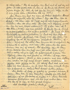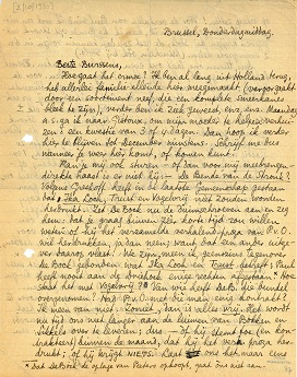 Hoe gaat het ermee? Ik ben al lang uit Holland terug, heb allerlei familie-ellende hier meegemaakt (veroorzaakt door een soortement neef, die een komplete smeerkanes bleek te zijn),1267 verder ben ik ziek geweest, enz. enz. Maandag a.s. ga ik naar Gistoux, om mijn moeder te helpen verhuizen: een kwestie van 3 of 4 dagen. Dan hoop ik verder hier te blijven tot December minstens. Schrijf me dus wanneer je weer hier komt, of komen kunt.