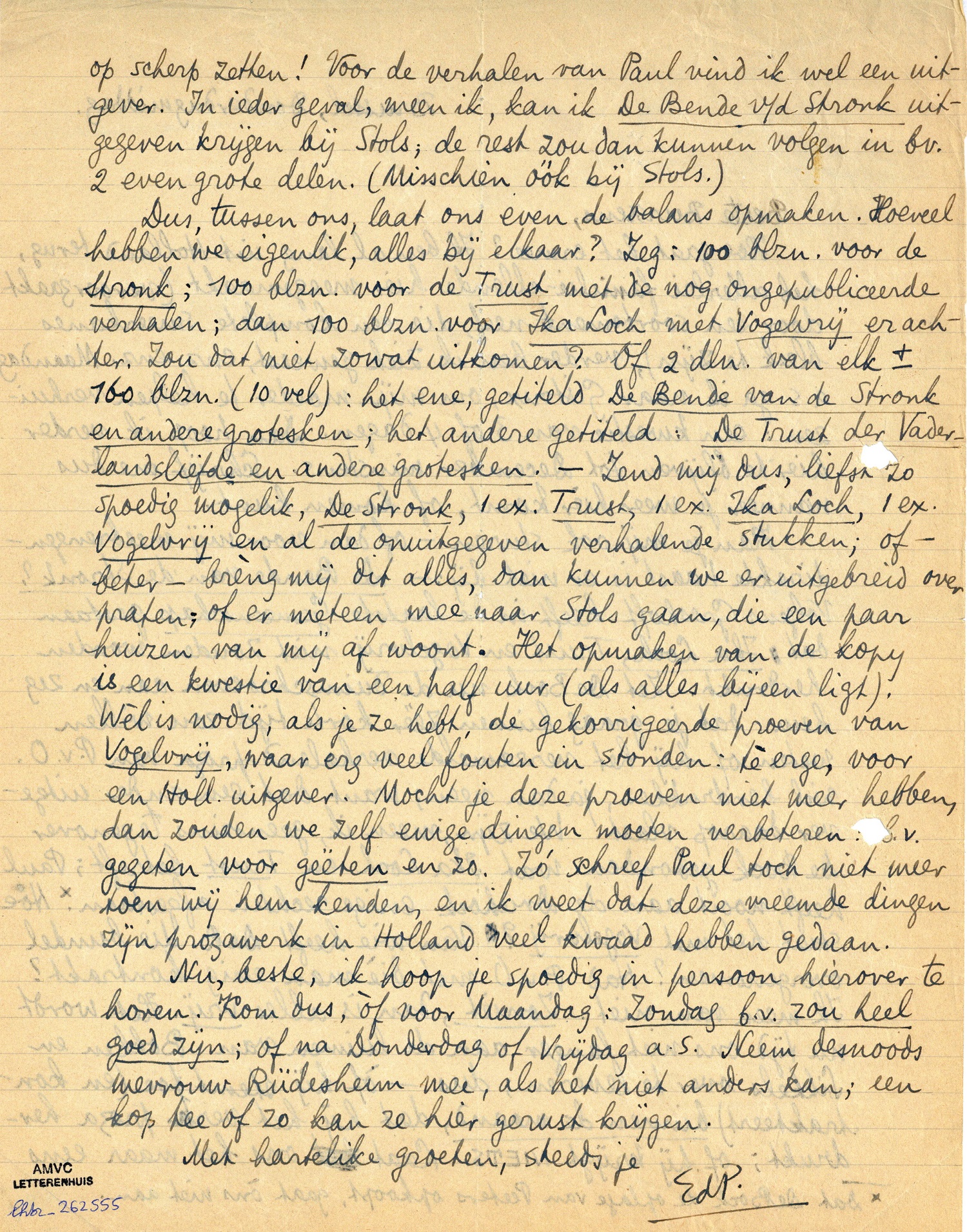 Dus, tussen ons, laat ons even de balans opmaken. Hoeveel hebben we eigenlik, alles bij elkaar? Zeg: 100 blzn. voor de Stronk; 100 blzn. voor de Trust met de nog ongepubliceerde verhalen; dan 100 blzn. voor Ika Loch met Vogelvrij er achter. Zou dat niet zowat uitkomen? Of 2 dln. van elk ± 160 blzn. (10 vel): het ene, getiteld De Bende van de Stronk en andere grotesken; het andere getiteld: De Trust der Vaderlandsliefde en andere grotesken. - Zend mij dus, liefst zo spoedig mogelik, De Stronk, 1 ex. Trust, 1 ex. Ika Loch, 1 ex. Vogelvrij en al de onuitgegeven verhalende stukken; of - beter - brèng mij dit alles, dan kunnen we er uitgebreid over praten; of er meteen mee naar Stols gaan, die een paar huizen van mij af woont. Het opmaken van de kopy is een kwestie van een half uur (als alles bijeen ligt). Wèl is nodig, als je ze hebt, de gekorrigeerde proeven van Vogelvrij, waar erg veel fouten in stonden: tè erge, voor een Holl. uitgever. Mocht je deze proeven niet meer hebben, dan zouden we zelf enige dingen moeten verbeteren: b.v. gegeten voor geëten en zo. Zó schreef Paul toch niet meer toen wij hem kenden, en ik weet dat deze vreemde dingen zijn prozawerk in Holland veel kwaad hebben gedaan.