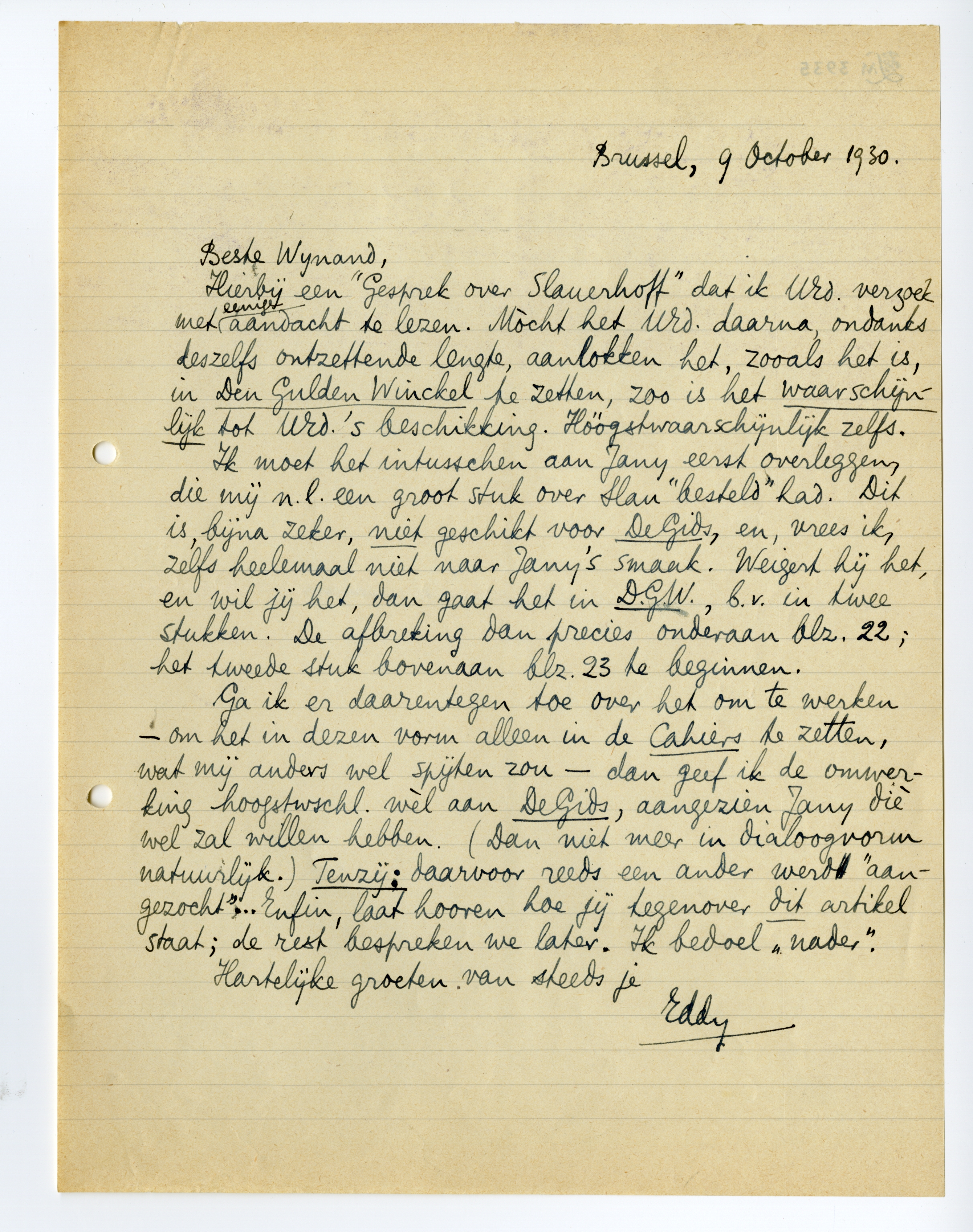 Hierbij een ‘Gesprek over Slauerhoff dat ik UEd. verzoek met eenige aandacht te lezen. Mòcht het UEd. daarna, ondanks deszelfs ontzettende lengte, aanlokken het, zooals het is, in Den Gulden Winckel te zetten, zoo is het waarschijnlijk tot UEd.'s beschikking. Hóógstwaarschijnlijk zelfs.