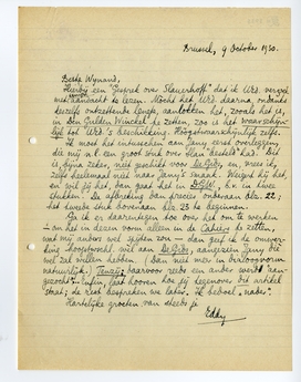 Ga ik er daarentegen toe over het om te werken - om het in dezen vorm alleen in de Cahiers te zetten, wat mij anders wel spijten zou - dan geef ik de omwerking hoogstwschl. wèl aan De Gids, aangezien Jany diè wel zal willen hebben. (Dan niet meer in dialoogvorm natuurlijk.) Tenzij: daarvoor reeds een ander werd ‘aangezocht’... Enfin, laat hooren hoe jij tegenover dit artikel staat; de rest bespreken we later. Ik bedoel ‘nader’.