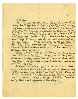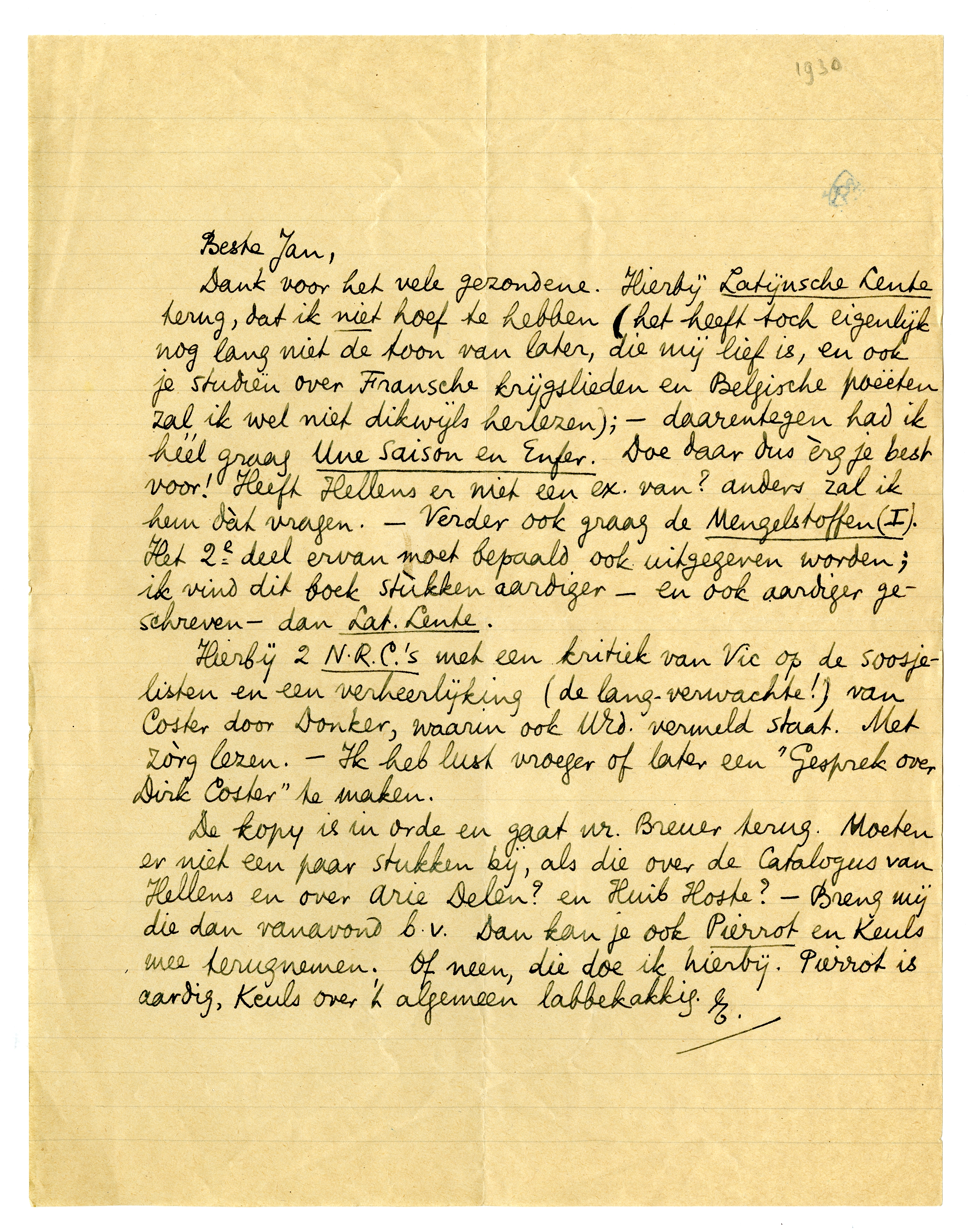 Dank voor het vele gezondene. Hierbij Latijnsche Lente terug, dat ik niet hoef te hebben (het heeft toch eigenlijk nog lang niet de toon van later, die mij lief is, en ook je studiën over Fransche krijgslieden en Belgische poëeten1302 zal ik wel niet dikwijls herlezen); - daarentegen had ik héél graag Une Saison en Enfer. Doe daar dus èrg je best voor! Heeft Hellens er niet een ex. van? anders zal ik hem dàt vragen. - Verder ook graag de Mengelstoffen (I). Het 2e deel ervan moet bepaald ook uitgegeven worden; ik vind dit boek stùkken aardiger - en ook aardiger geschreven - dan Lat. Lente.