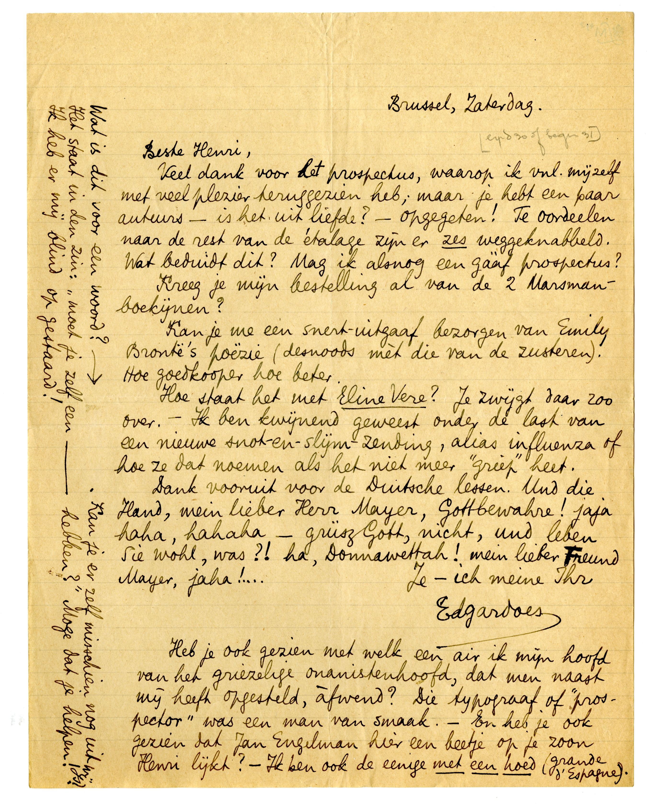 Hoe staat het met Eline Vere? Je zwijgt daar zoo over. - Ik ben kwijnend geweest onder de last van een nieuwe snot-en-slijm-zending, alias influenza of hoe ze dat noemen als het niet meer ‘griep’ heet.