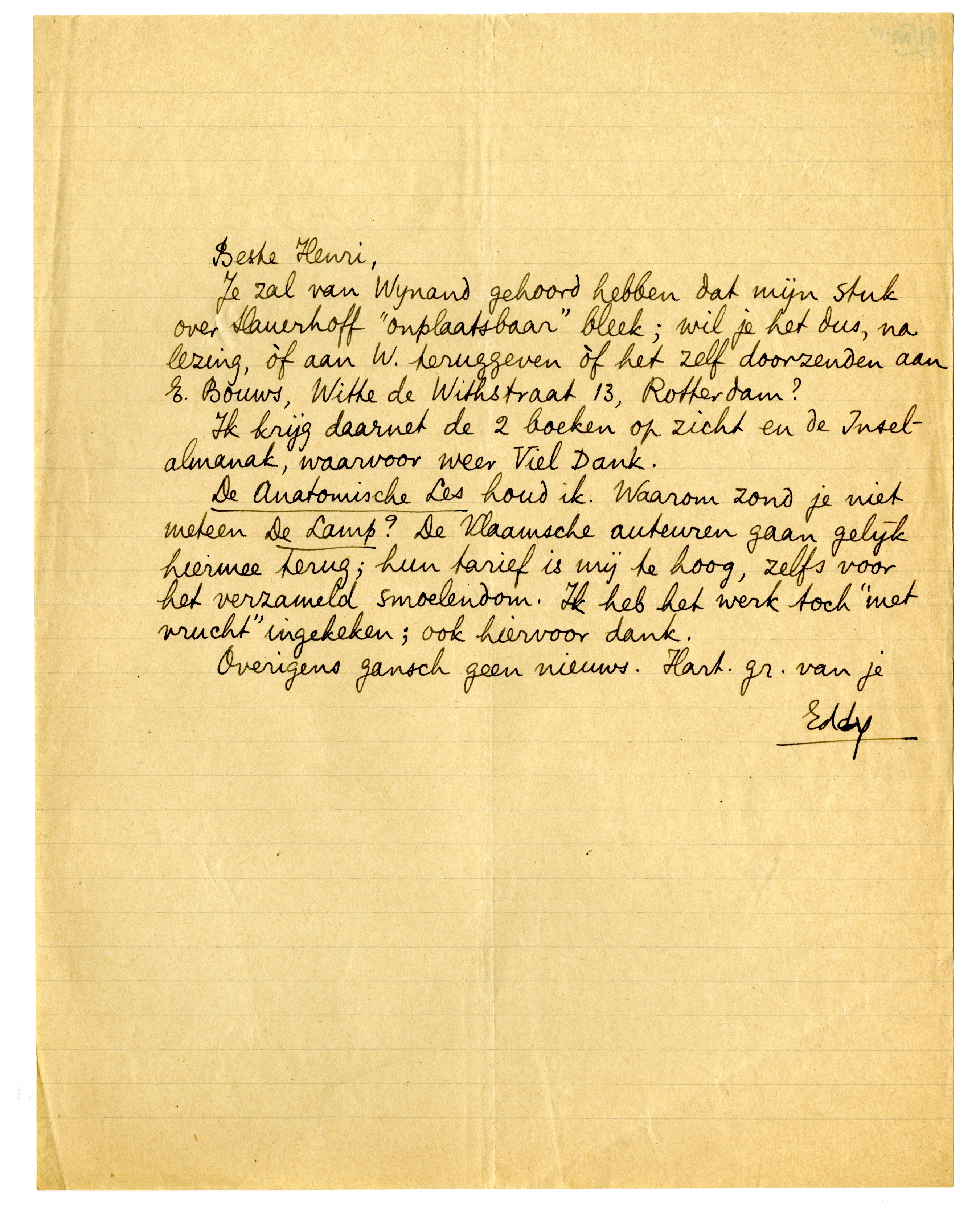 Je zal van Wynand gehoord hebben dat mijn stuk over Slauerhoff ‘onplaatsbaar’ bleek; wil je het dus, na lezing, òf aan W. teruggeven òf het zelf doorzenden aan E. Bouws, Witte de Withstraat 13, Rotterdam?