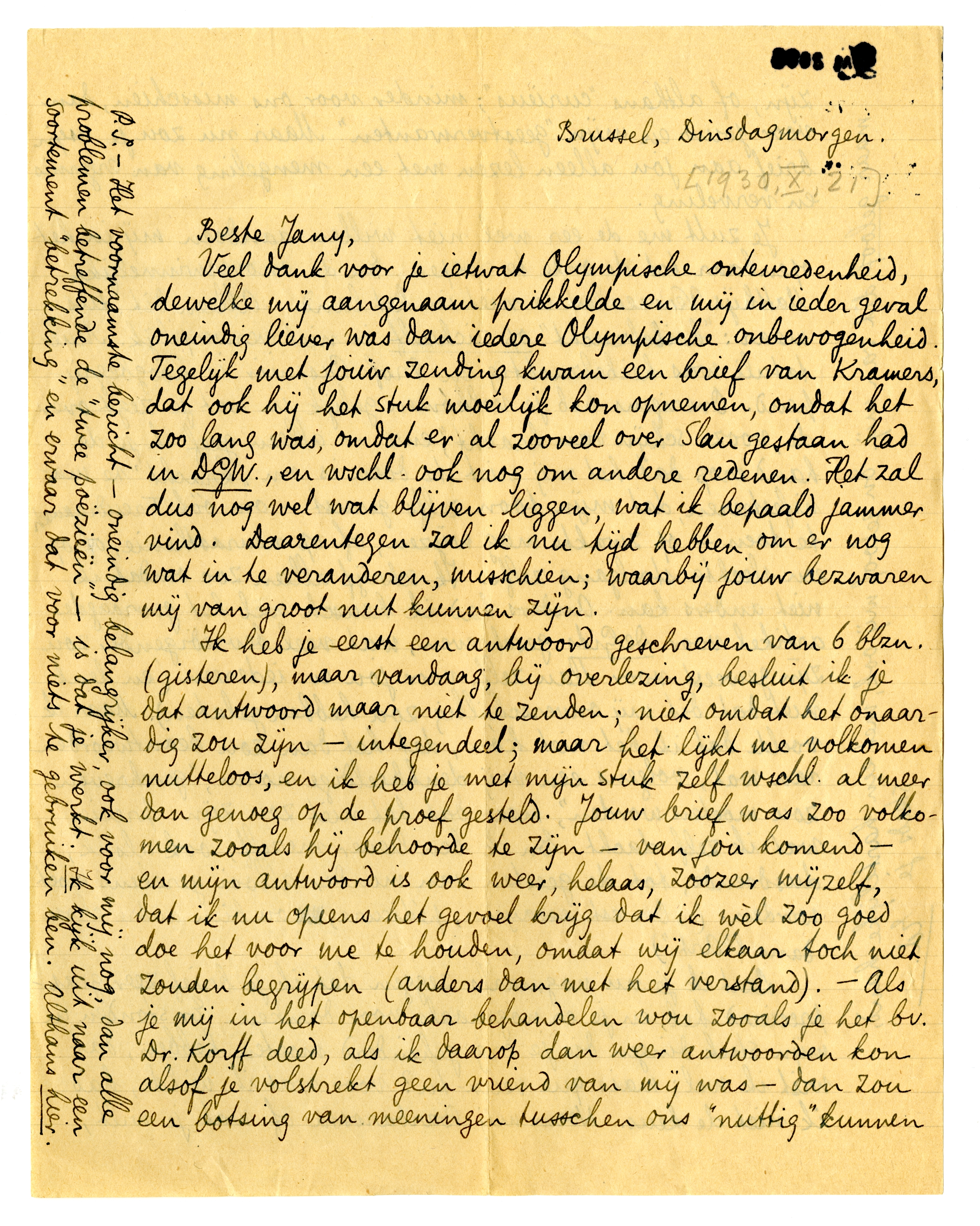 Ik heb je eerst een antwoord geschreven van 6 blzn. (gisteren), maar vandaag, bij overlezing, besluit ik je dat antwoord maar niet te zenden; niet omdat het onaardig zou zijn - integendeel; maar het lijkt me volkomen nutteloos, en ik heb je met mijn stuk zelf wschl. al meer dan genoeg op de proef gesteld. Jouw brief was zoo volkomen zooals hij behoorde te zijn - van jou komend - en mijn antwoord is ook weer, helaas, zoozeer mijzelf, dat ik nu opeens het gevoel krijg dat ik wèl zoo goed doe het voor me te houden, omdat wij elkaar toch niet zouden begrijpen (anders dan met het verstand).1315 - Als je mij in het openbaar behandelen wou zooals je het bv. Dr. Korff deed, als ik daarop dan weer antwoorden kon alsof je volstrekt geen vriend van mij was - dan zou een botsing van meeningen tusschen ons ‘nuttig’ kunnen zijn, of althans ‘curieus’; minder voor ons misschien, dan voor jouw en mijn ‘geestverwanten’. Maar nu zou je mijn brief aan jou alleen lezen met een mengeling van ergernis en verveling.