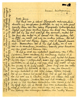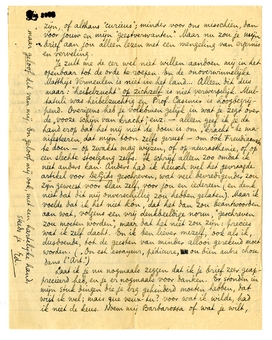 Veel dank voor je ietwat Olympische ontevredenheid, dewelke mij aangenaam prikkelde en mij in ieder geval oneindig liever was dan iedere Olympische onbewogenheid. Tegelijk met jouw zending kwam een brief van Kramers, dat ook hij het stuk moeilijk kon opnemen, omdat het zoo lang was, omdat er al zooveel over Slau gestaan had in DGW., en wschl. ook nog om andere redenen. Het zal dus nog wel wat blijven liggen, wat ik bepaald jammer vind. Daarentegen zal ik nu tijd hebben om er nog wat in te veranderen, misschien; waarbij jouw bezwaren mij van groot nut kunnen zijn.