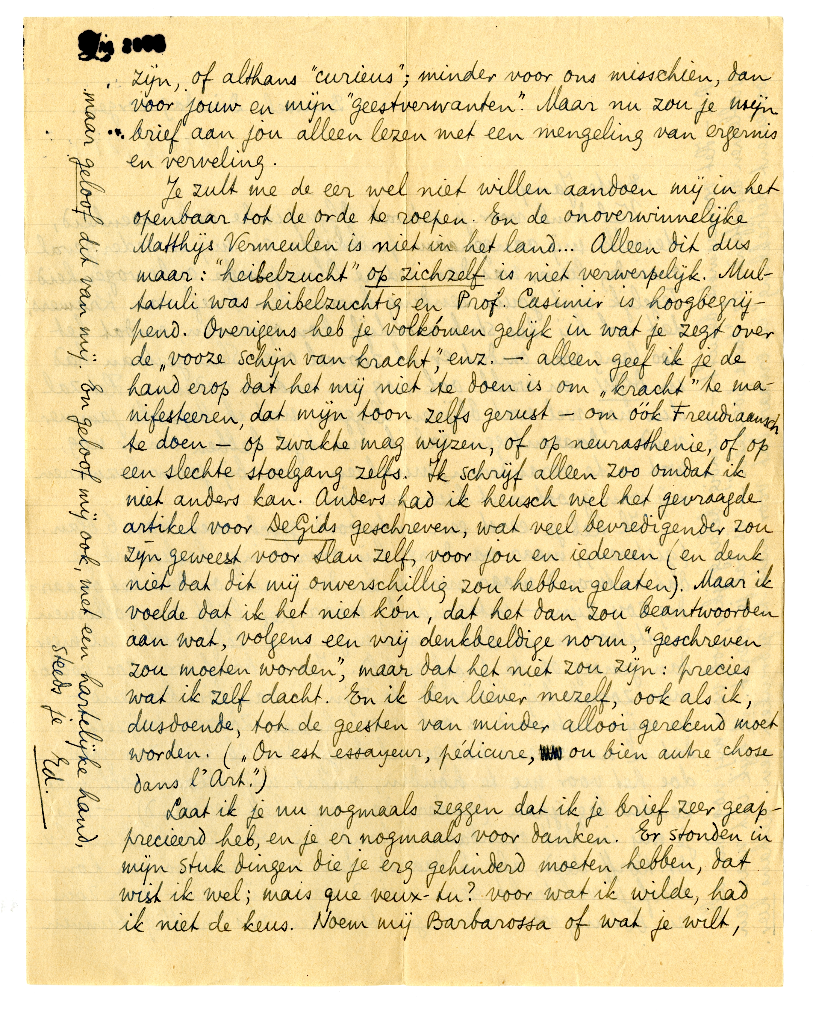 Je zult me de eer wel niet willen aandoen mij in het openbaar tot de orde te roepen. En de onoverwinnelijke Matthijs Vermeulen is niet in het land... Alleen dit dus maar: ‘heibelzucht’ op zichzelf is niet verwerpelijk. Multatuli was heibelzuchtig en Prof. Casimir is hoogbegrijpend. Overigens heb je volkómen gelijk in wat je zegt over de ‘vooze schijn van kracht’, enz. - alleen geef ik je de hand erop dat het mij niet te doen is om ‘kracht’ te manifesteeren, dat mijn toon zelfs gerust - om óók Freudiaansch te doen - op zwakte mag wijzen, of op neurasthenie, of op een slechte stoelgang zelfs. Ik schrijf alleen zoo omdat ik niet anders kan. Anders had ik heusch wel het gevraagde artikel voor De Gids geschreven, wat veel bevredigender zou zijn geweest voor Slau zelf, voor jou en iedereen (en denk niet dat dit mij onverschillig zou hebben gelaten). Maar ik voelde dat ik het niet kón, dat het dan zou beantwoorden aan wat, volgens een vrij denkbeeldige norm, ‘geschreven zou moeten worden’, maar dat het niet zou zijn: precies wat ik zelf dacht. En ik ben liever mezelf, ook als ik, dusdoende, tot de geesten van minder allooi gerekend moet worden. (‘On est essayeur, pédicure, ou bien autre chose dans l'Art’.1316)