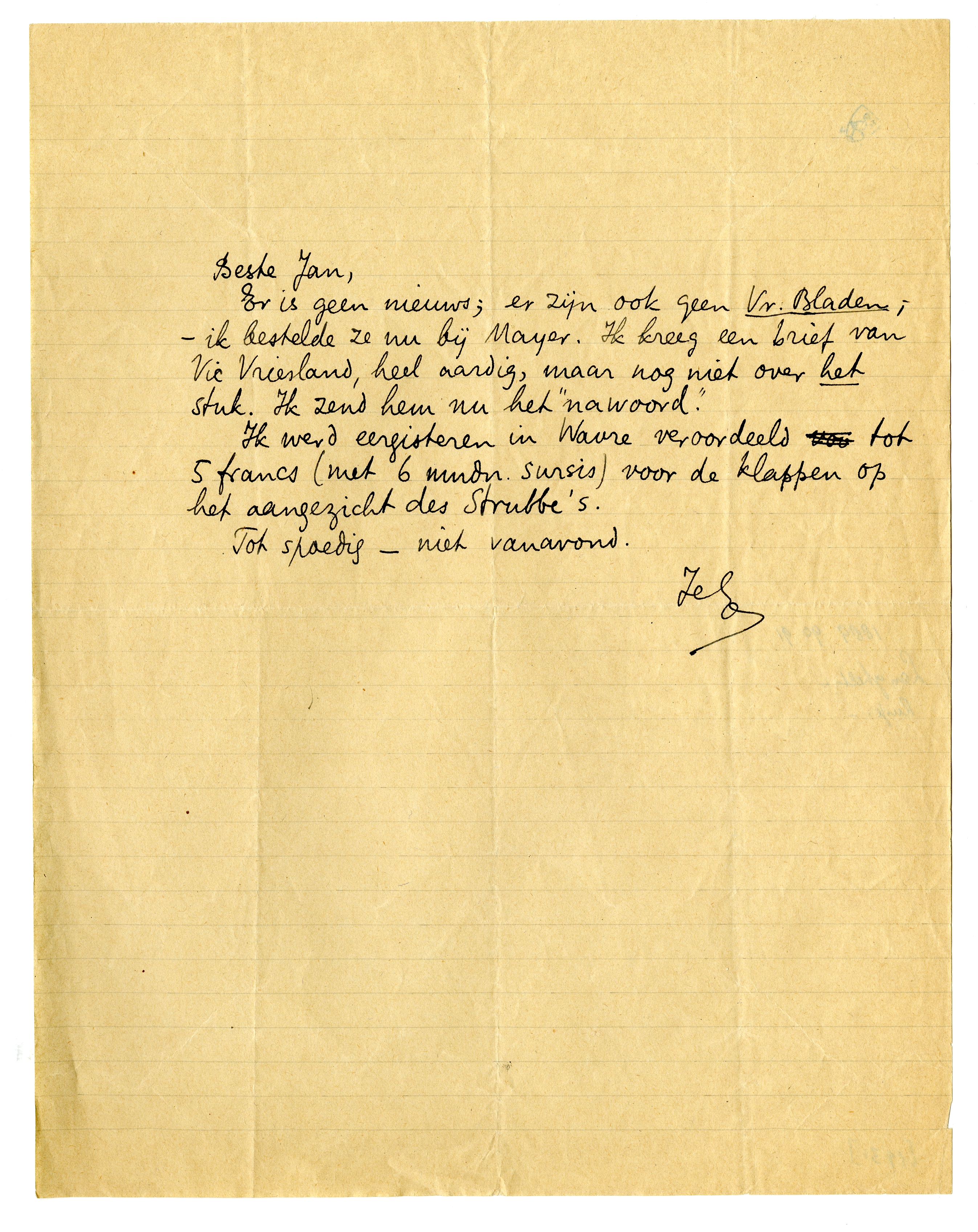 Ik werd eergisteren in Wavre veroordeeld tot 5 francs (met 6 mndn. sursis) voor de klappen op het aangezicht des Strubbe's.