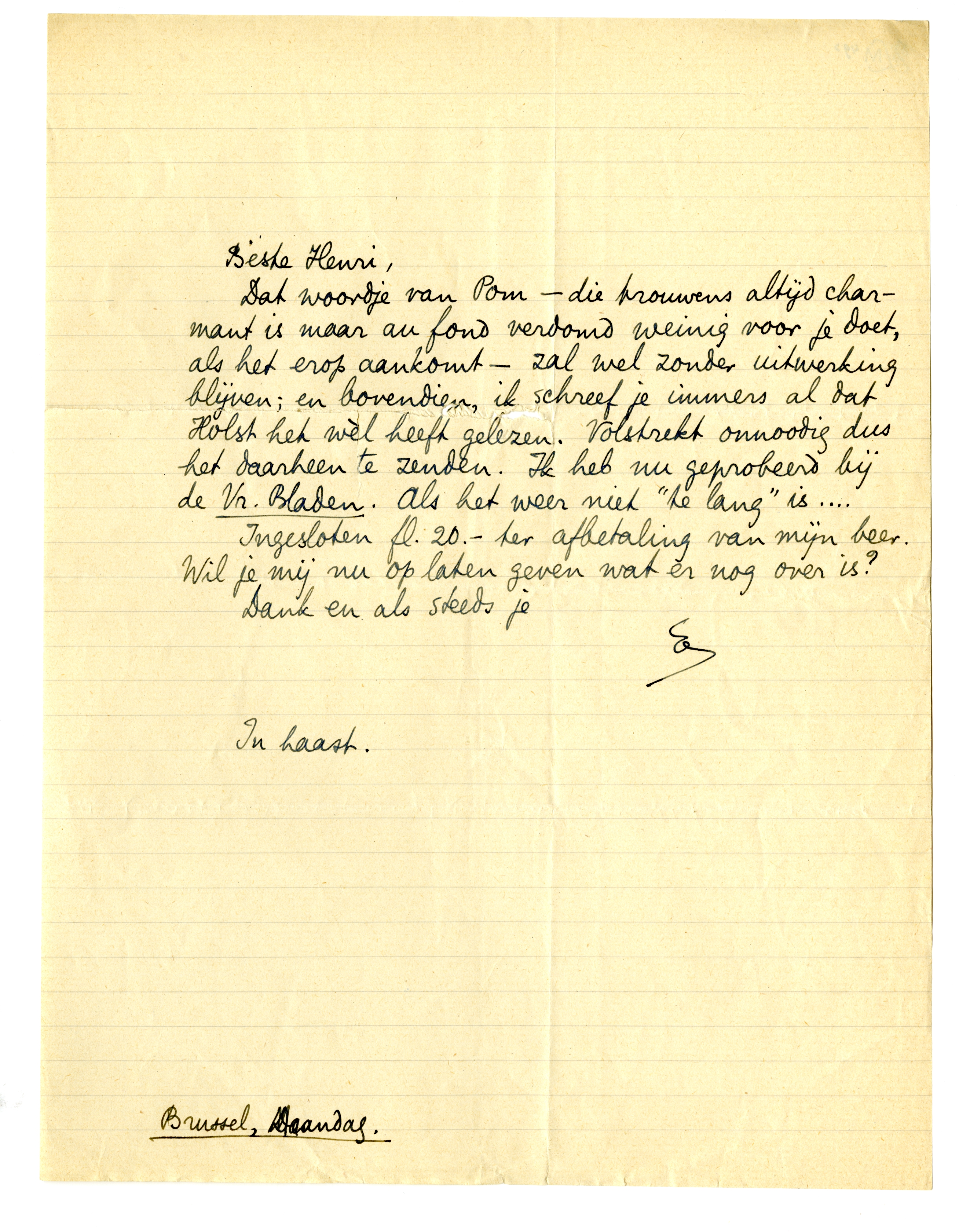 Dat woordje van Pom - die trouwens altijd charmant is maar au fond verdomd weinig voor je doet, als het erop aankomt - zal wel zonder uitwerking blijven; en bovendien, ik schreef je immers al1349 dat Holst het wèl heeft gelezen. Volstrekt onnoodig dus het daarheen te zenden. Ik heb nu geprobeerd bij de Vr. Bladen. Als het weer niet ‘te lang’ is....