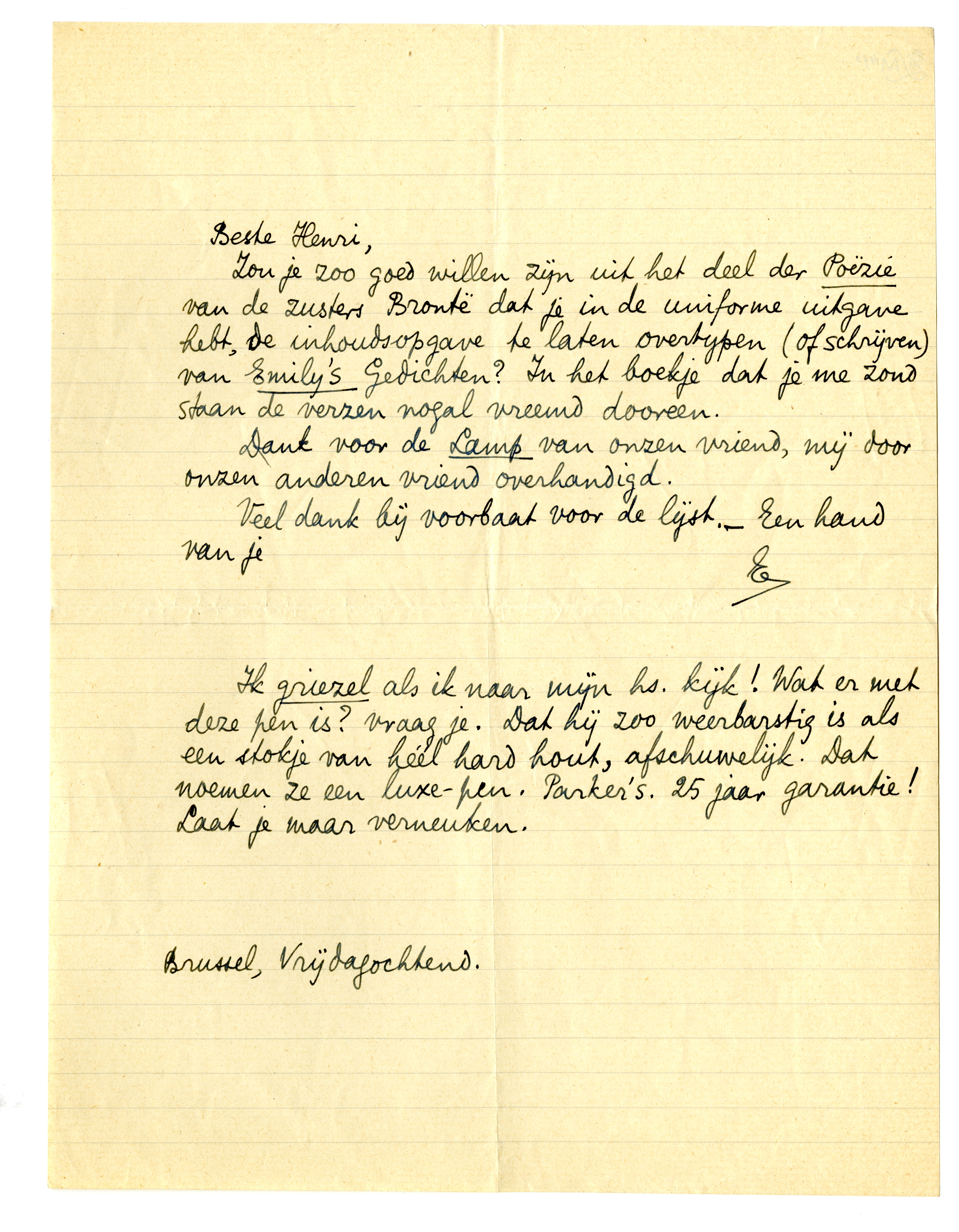Zou je zoo goed willen zijn uit het deel der Poëzie van de zusters Brontë1361 dat je in de uniforme uitgave hebt, de inhoudsopgave te la-ten overtypen (of schrijven) van Emily's Gedichten? In het boekje dat je me zond staan de verzen nogal vreemd dooreen.