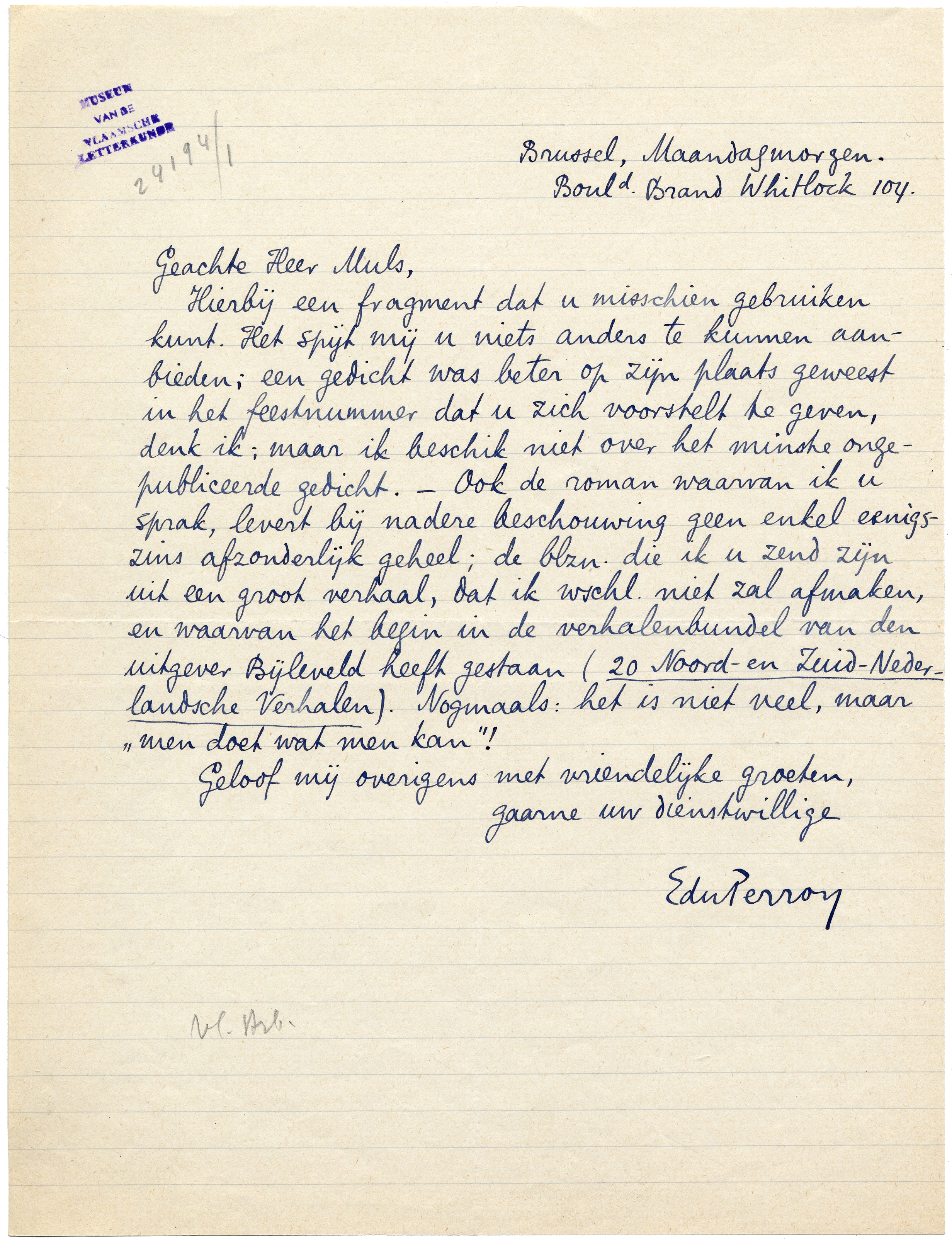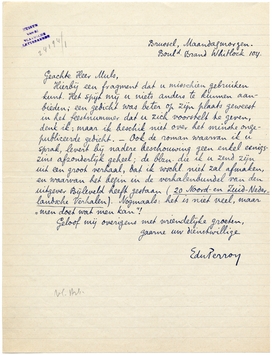 Hierbij een fragment dat u misschien gebruiken kunt. Het spijt mij u niets anders te kunnen aanbieden; een gedicht was beter op zijn plaats geweest in het feestnummer dat u zich voorstelt te geven, denk ik; maar ik beschik niet over het minste ongepubliceerde gedicht. - Ook de roman waarvan ik u sprak, levert bij nadere beschouwing geen enkel eenigszins afzonderlijk geheel; de blzn. die ik u zend zijn uit een groot verhaal, dat ik wschl. niet zal afmaken, en waarvan het begin in de verhalenbundel van den uitgever Bijleveld heeft gestaan (20 Noord-en Zuid-Nederlandsche Verhalen). Nogmaals: het is niet veel, maar ‘men doet wat men kan’!