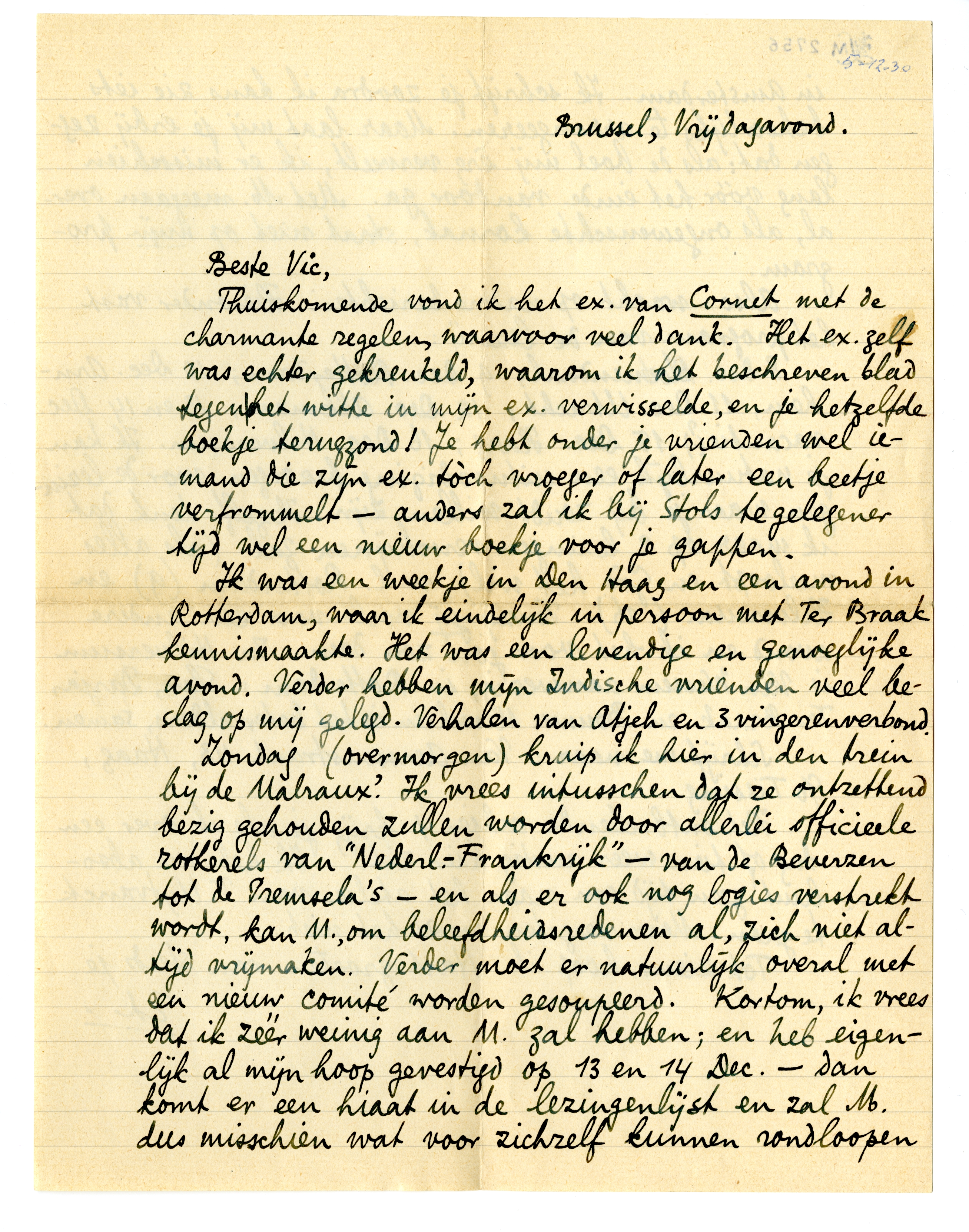 Zondag (overmorgen) kruip ik hier in den trein bij de Malraux'. Ik vrees intusschen dat ze ontzettend bezig gehouden zullen worden door allerlei officieele rotkerels van ‘Nederl.-Frankrijk’ - van de Beverzen tot de Premsela's - en als er ook nog logies verstrekt wordt, kan M., om beleefdheidsredenen al, zich niet altijd vrijmaken. Verder moet er natuurlijk overal met een nieuw comité worden gesoupeerd. Kortom, ik vrees dat ik zéér weinig aan M. zal hebben; en heb eigenlijk al mijn hoop gevestigd op 13 en 14 Dec. - dan komt er een hiaat in de lezingenlijst en zal M. dus misschien wat voor zichzelf kunnen rondloopen in Amsterdam. Ik schrijf je zoodra ik kans zie iets behoorlijks te arrangeeren. Maar laat mij je erbij zeggen dat: als de boel mij èrg verveelt, ik er misschien lang vóór het einde vandoor ga. Met M. meegaan overal, als ongewenschte kornak, staat niet op mijn program.