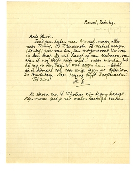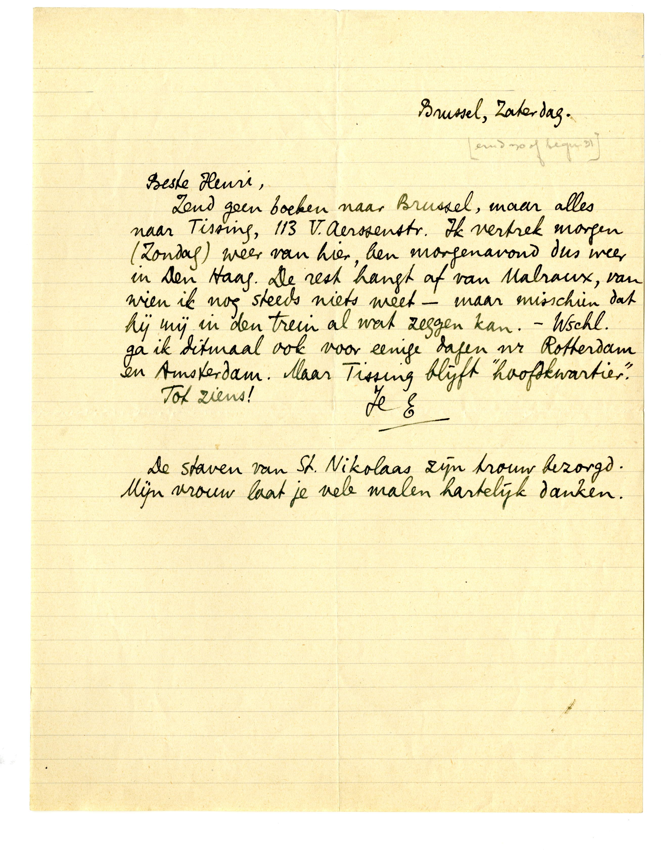 Aerssenstr. Ik vertrek morgen (Zondag) weer van hier, ben morgenavond dus weer in Den Haag. De rest hangt af van Malraux, van wien ik nog steeds niets weet - maar misschien dat hij mij in den trein al wat zeggen kan. - Wschl. ga ik ditmaal ook voor eenige dagen nr Rotterdam en Amsterdam. Maar Tissing blijft ‘hoofdkwartier’.