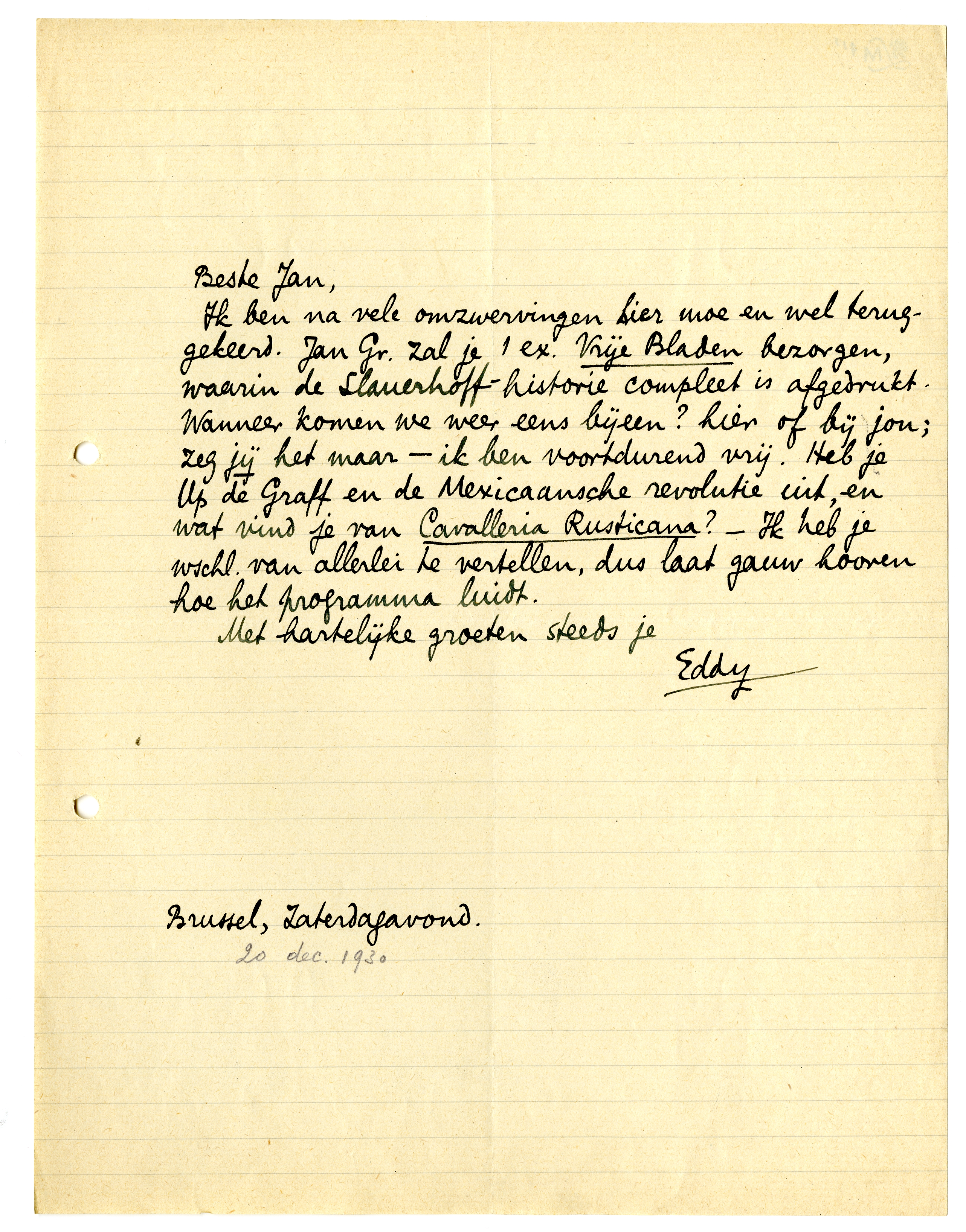 Ik ben na vele omzwervingen hier moe en wel teruggekeerd. Jan Gr. zal je 1 ex. Vrije Bladen bezorgen, waarin de Slauerhoff-historie compleet is afgedrukt. Wanneer komen we weer eens bijeen? hier of bij jou; zeg jij het maar - ik ben voortdurend vrij. Heb je Up de Graff en de Mexicaansche revolutie1409 uit, en wat vind je van Cavalleria Rusticana? - Ik heb je wschl. van allerlei te vertellen, dus laat gauw hooren hoe het programma luidt.