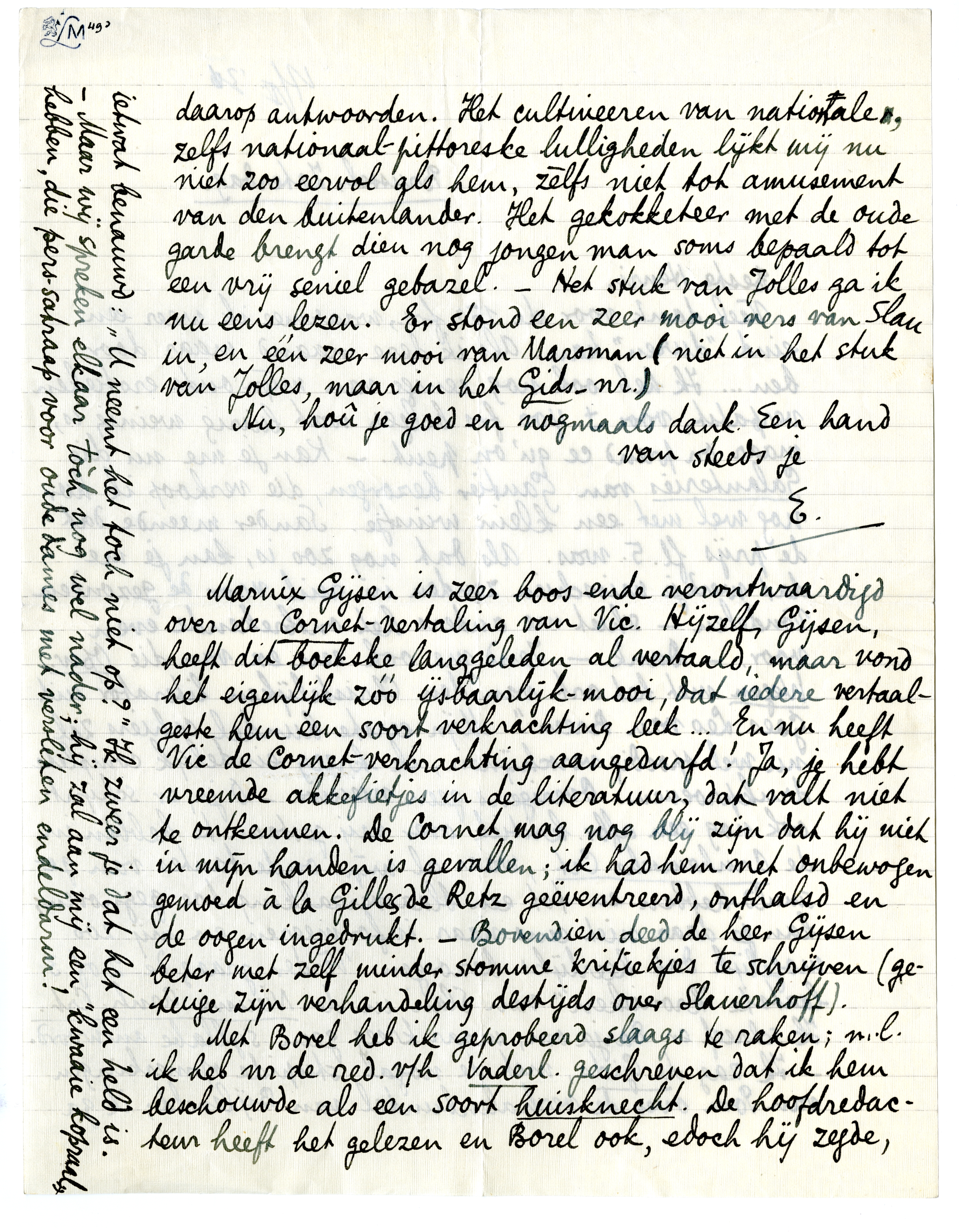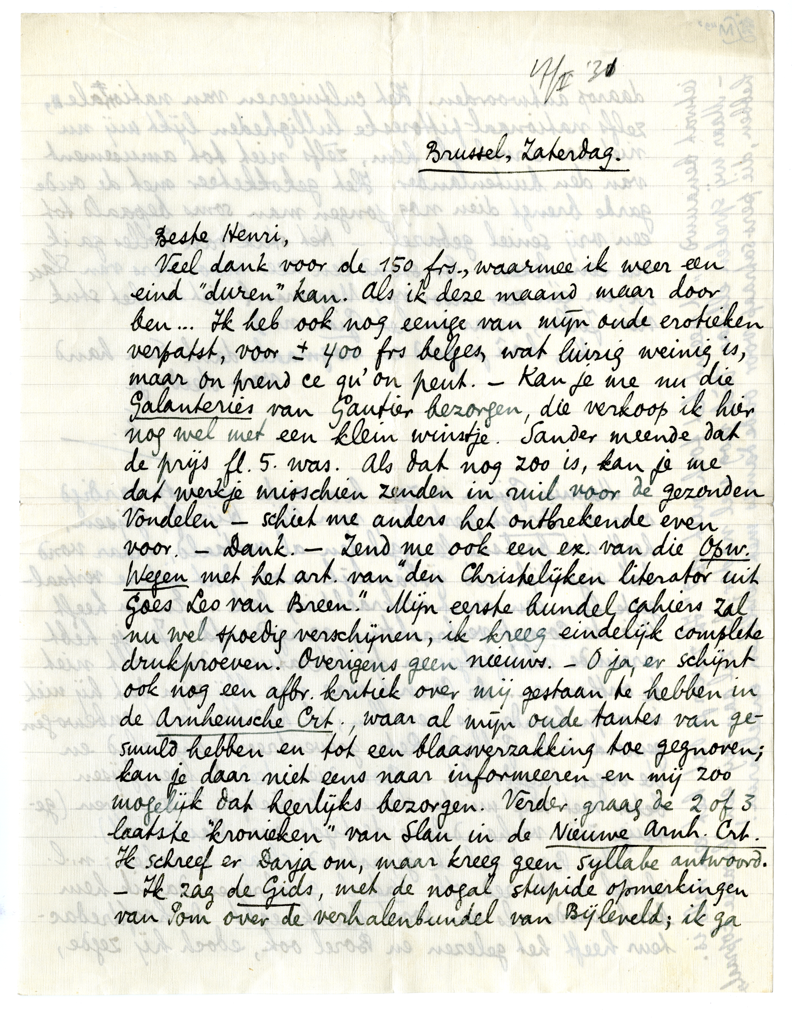 Veel dank voor de 150 frs., waarmee ik weer een eind ‘duren’ kan. Als ik deze maand maar door ben... Ik heb ook nog eenige van mijn oude erotieken verpatst, voor ± 400 frs belges, wat luizig weinig is, maar on prend ce qu'on peut. - Kan je me nu die Galanteries van Gautier bezorgen, die verkoop ik hier nog wel met een klein winstje. Sander meende dat de prijs fl.5 was. Als dat nog zoo is, kan je me dat werkje misschien zenden in ruil voor de gezonden Vondelen - schiet me anders het ontbrekende even voor. - Dank. - Zend me ook een ex. van die Opw. Wegen met het art. van ‘den Christelijken literator uit Goes Leo van Breen’1444. Mijn eerste bundel cahiers zal nu wel spoedig verschijnen, ik kreeg eindelijk complete drukproeven. Overigens geen nieuws. - O ja, er schijnt ook nog een afbr. kritiek over mij gestaan te hebben in de Arnhemsche Crt.,1445 waar al mijn oude tantes van gesmuld hebben en tot een blaasverzakking toe gegnoven; kan je daar niet eens naar informeeren en mij zoo mogelijk dat heerlijks bezorgen. Verder graag de 2 of 3 laatste ‘kronieken’ van Slau in de Nieuwe Arnh. Crt.1446 Ik schreef er Darja om, maar kreeg geen syllabe antwoord. - Ik zag de Gids, met de nogal stupide opmerkingen van Pom over de verhalenbundel van Bijleveld; ik ga daarop antwoorden. Het cultiveeren van nationale, zelfs nationaal-pittoreske lulligheden lijkt mij nu niet zoo eervol als hem, zèlfs niet tot amusement van den buitenlander. Het gekokketeer met de oude garde brengt dien nog jongen man soms bepaald tot een vrij seniel gebazel. - Het stuk van Jolles1447 ga ik nu eens lezen. Er stond een zeer mooi vers van Slau in, en één zeer mooi van Marsman1448 (niet in het stuk van Jolles, maar in het Gids-ra.)