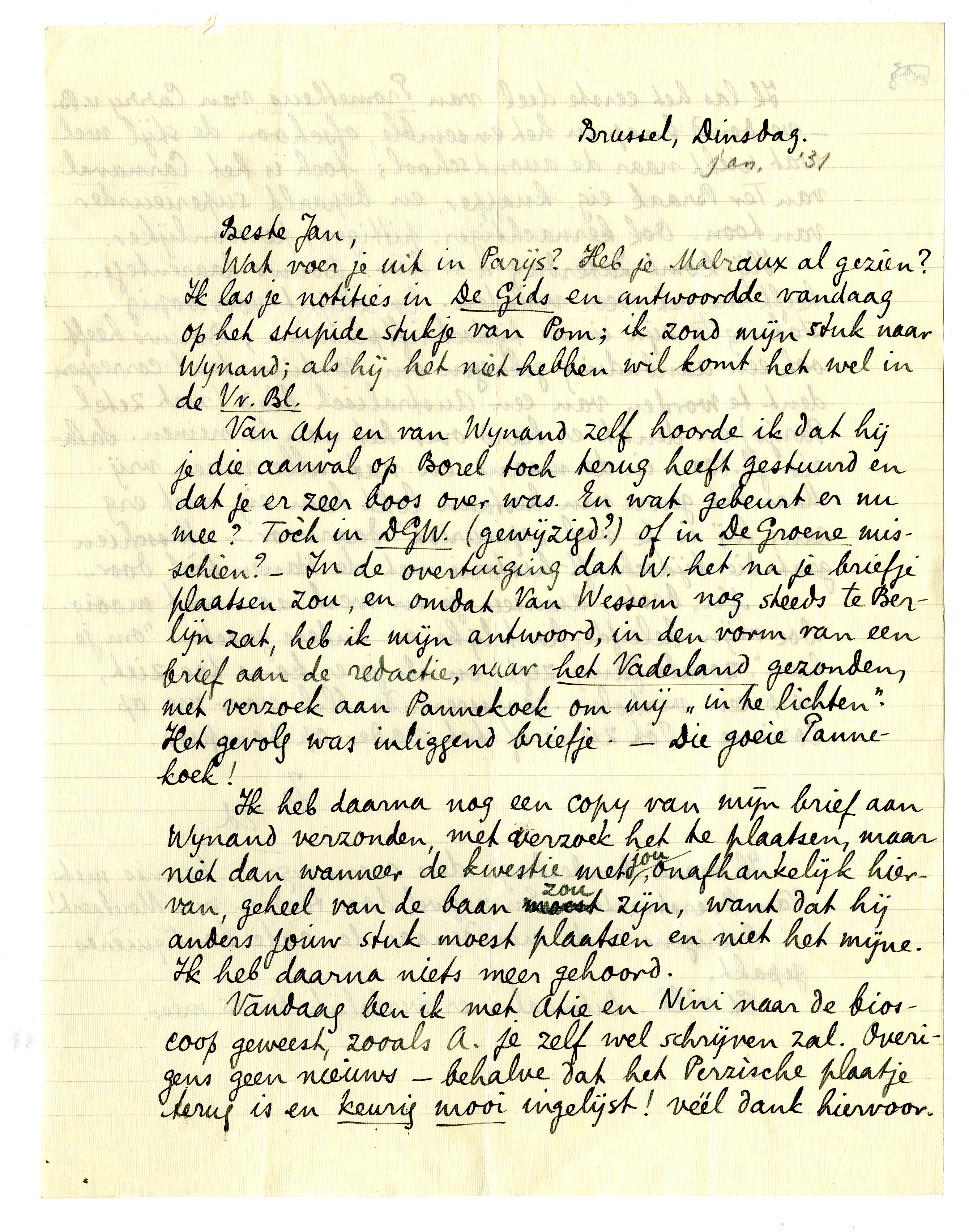 Wat voer je uit in Parijs? Heb je Malraux al gezien? Ik las je notities in De Gids1449 en antwoordde vandaag op het stupide stukje van Pom; ik zond mijn stuk naar Wynand; als hij het niet hebben wil komt het wel in de Vr. Bl.