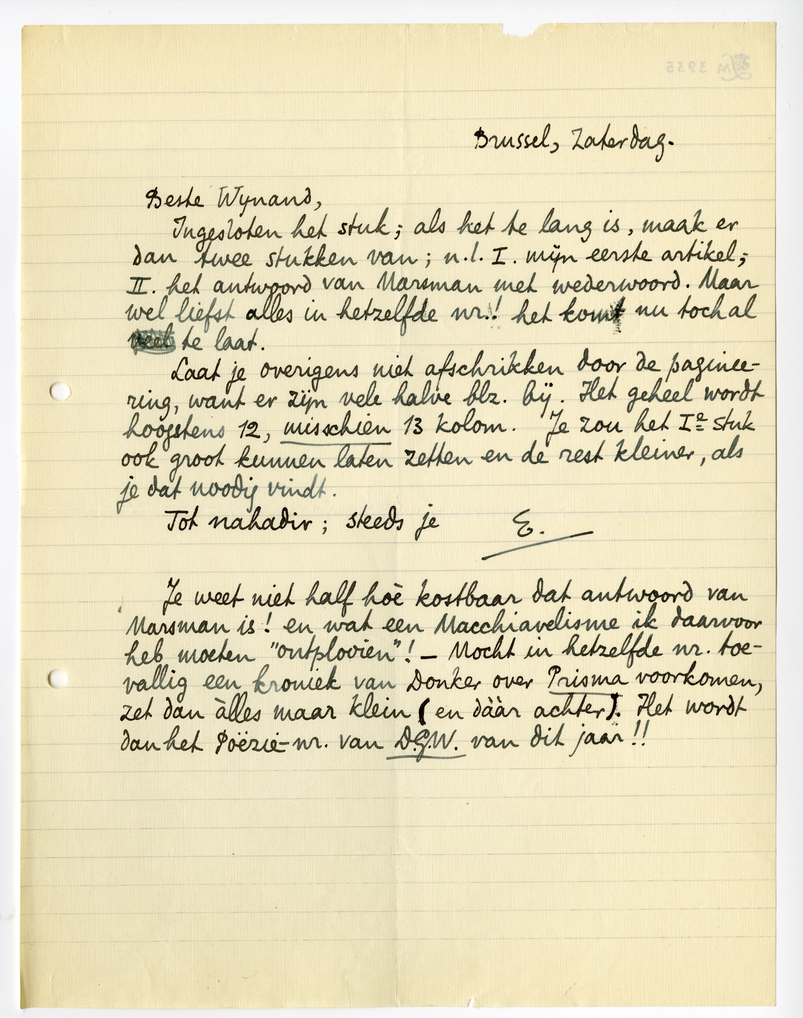 Je weet niet half hoè kostbaar dat antwoord van Marsman is! en wat een Macchiavelisme ik daarvoor heb moeten ‘ontplooien’! - Mocht in hetzelfde nr. toevallig een kroniek van Donker over Prisma voorkomen, zet dan àlles maar klein (en dààr achter). Het wordt dan het Poëzie-nr. van D.G.W. van dit jaar!!