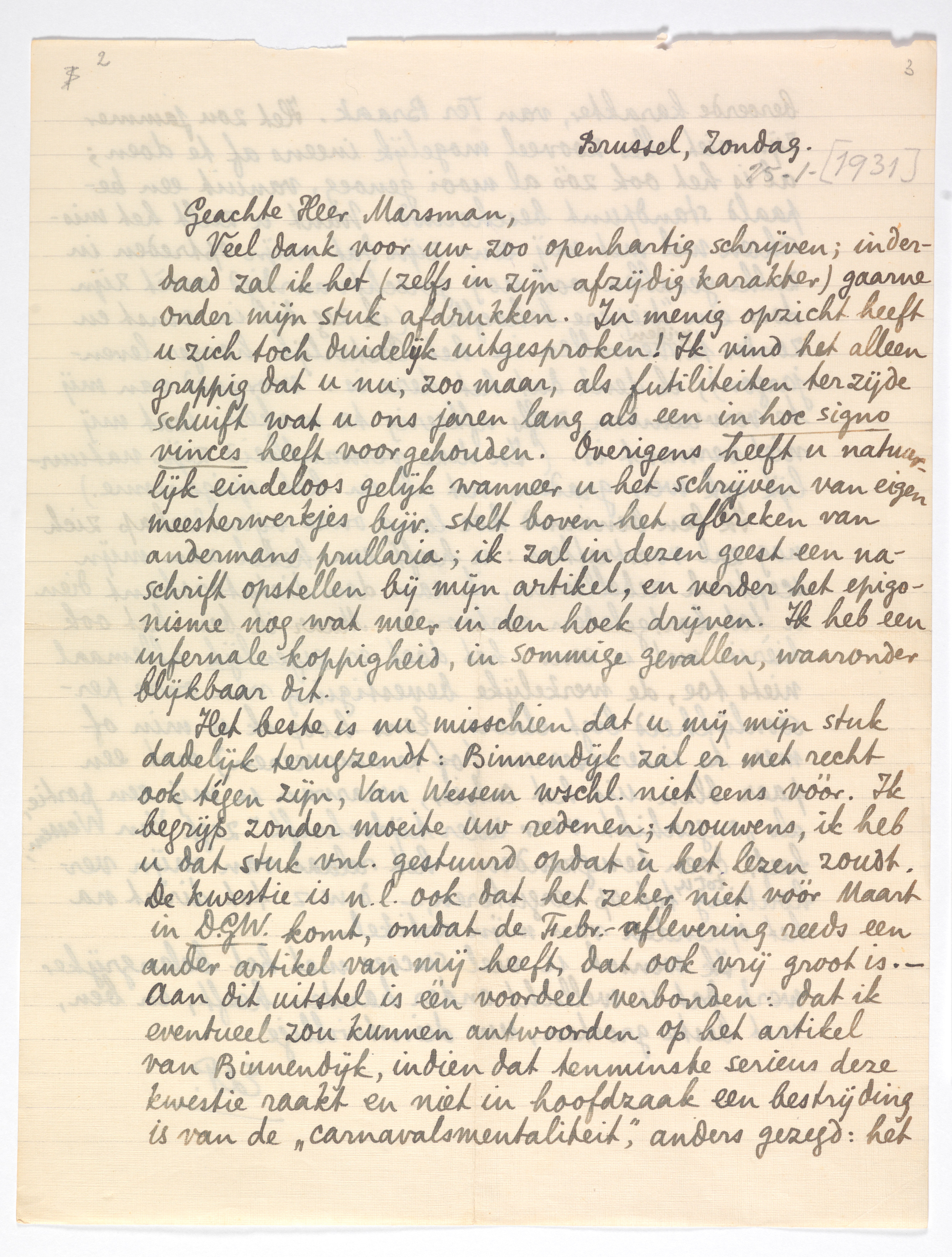Het beste is nu misschien dat u mij mijn stuk dadelijk terugzendt: Binnendijk zal er met recht ook tégen zijn, Van Wessem wschl. niet eens vóór. Ik begrijp zonder moeite uw redenen; trouwens, ik heb u dat stuk vnl. gestuurd opdat ù het lezen zoudt. De kwestie is n.l. ook dat het zeker niet vóór Maart in D.G.W. komt, omdat de Febr.-aflevering reeds een ander artikel van mij heeft, dat ook vrij groot is.1483 - Aan dit uitstel is één voordeel verbonden: dat ik eventueel zou kunnen antwoorden op het artikel van Binnendijk,1484 indien dat tenminste serieus deze kwestie raakt en niet in hoofdzaak een bestrijding is van de ‘camavalsmentaliteit’, anders gezegd: het beroerde karakter, van Ter Braak. Het zou jammer zijn niet alles zooveel mogelijk ineens af te doen; al is het ook zóó al mooi genoeg, vanuit een bepaald standpunt beschouwd. Want u zult het misschien wel met mij eens zijn dat mijn optreden in zulke gevallen ook nog gerechtvaardigd moèt zijn door een ‘diepere behoefte’ (ik zeg dit in ernst en zonder te willen vervallen in het Costerlijk hooger-leven-jargon); ik denk dat het deze is: voorgoed van mij te vervreemden, zelfs afkeerig te maken, wat mij niet verwant is. (In deze verwantheid zijn natuurlijk ook weer graden, net als in het epigonisme.)