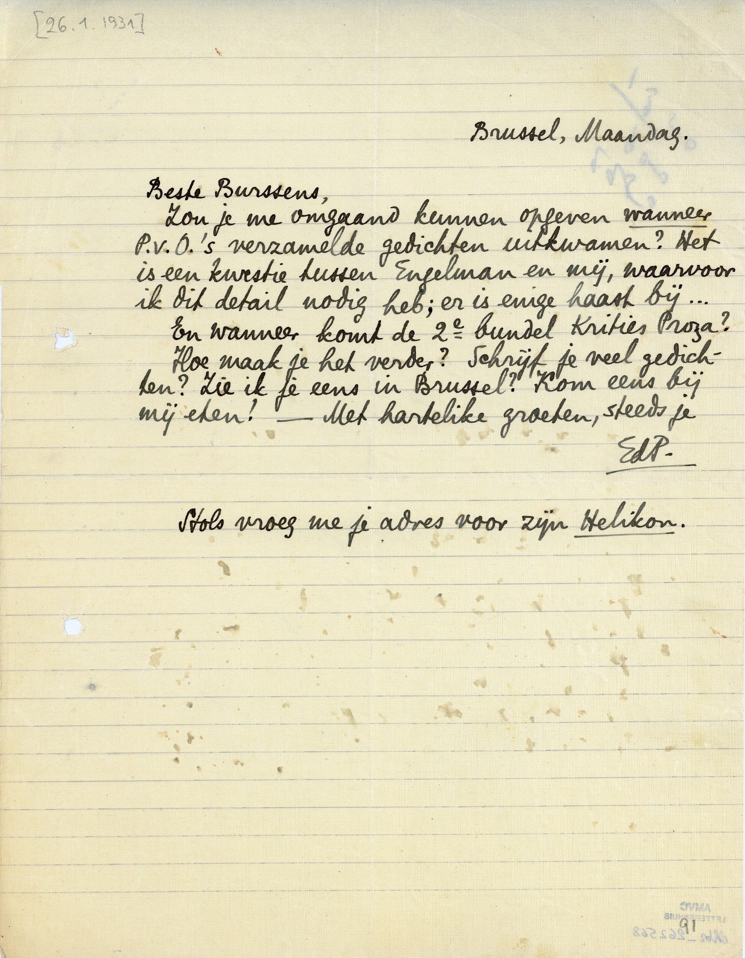 Hoe maak je het verder? Schrijf je veel gedichten? Zie ik je eens in Brussel? Kom eens bij mij eten! - Met hartelike groeten, steeds je