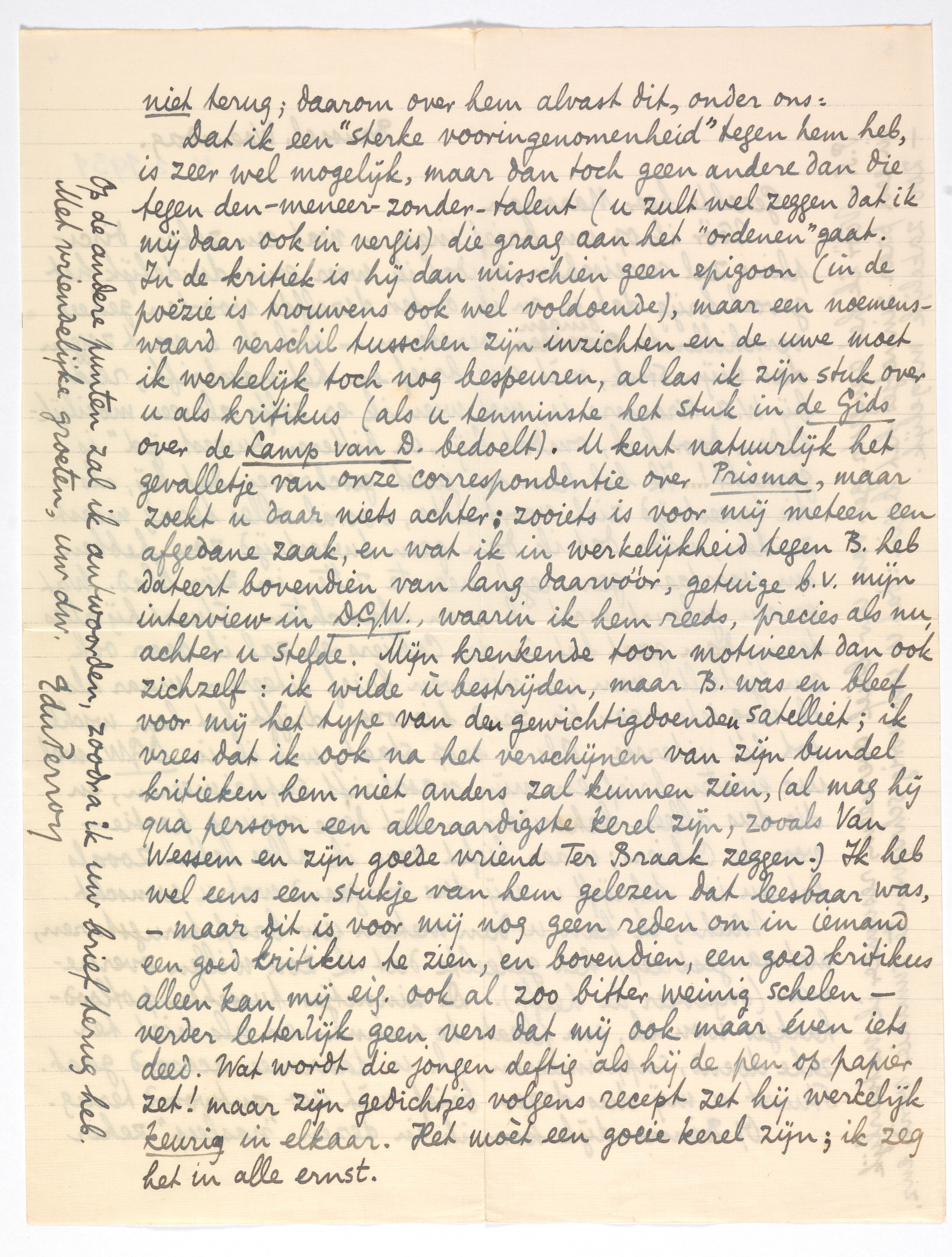Dat ik een ‘sterke vooringenomenheid’ tegen hem heb, is zeer wel mogelijk, maar dan toch geen andere dan die tegen den-meneerzonder-talent (u zult wel zeggen dat ik mij daar ook in vergis) die graag aan het ‘ordenen’ gaat. In de kritiek is hij dan misschien geen epigoon (in de poëzie is trouwens ook wel voldoende), maar een noemenswaard verschil tusschen zijn inzichten en de uwe moet ik werkelijk toch nog bespeuren, al las ik zijn stuk over u als kritikus (als u tenminste het stuk in de Gids over de Lamp van D. bedoelt).1517 U kent natuurlijk het gevalletje van onze correspondentie over Pris-ma, maar zoekt u daar niets achter: zooiets is voor mij meteen een afgedane zaak, en wat ik in werkelijkheid tegen B. heb dateert bovendien van lang daar vóór, getuige b.v. mijn interview in D.G.W.,1518 waarin ik hem reeds, precies als nu, achter u stelde. Mijn krenkende toon motiveert dan ook zichzelf: ik wilde ù bestrijden, maar B. was en bleef voor mij het type van den gewichtigdoenden satelliet; ik vrees dat ik ook na het verschijnen van zijn bundel kritieken1519 hem niet anders zal kunnen zien, (al mag hij qua persoon een alleraardigste kerel zijn, zooals Van Wessem en zijn goede vriend Ter Braak zeggen.) Ik heb wel eens een stukje van hem gelezen dat leesbaar was, - maar dit is voor mij nog geen reden om in iemand een goed kritikus te zien, en bovendien, een goed kritikus alleen kan mij eig. ook al zoo bitter weinig schelen - verder letterlijk geen vers dat mij ook maar éven iets deed. Wat wordt die jongen deftig als hij de pen op papier zet! maar zijn gedichtjes volgens recept zet hij werkelijk keurig in elkaar. Het moèt een goeie kerel zijn; ik zeg het in alle ernst.