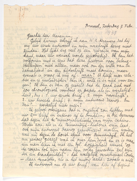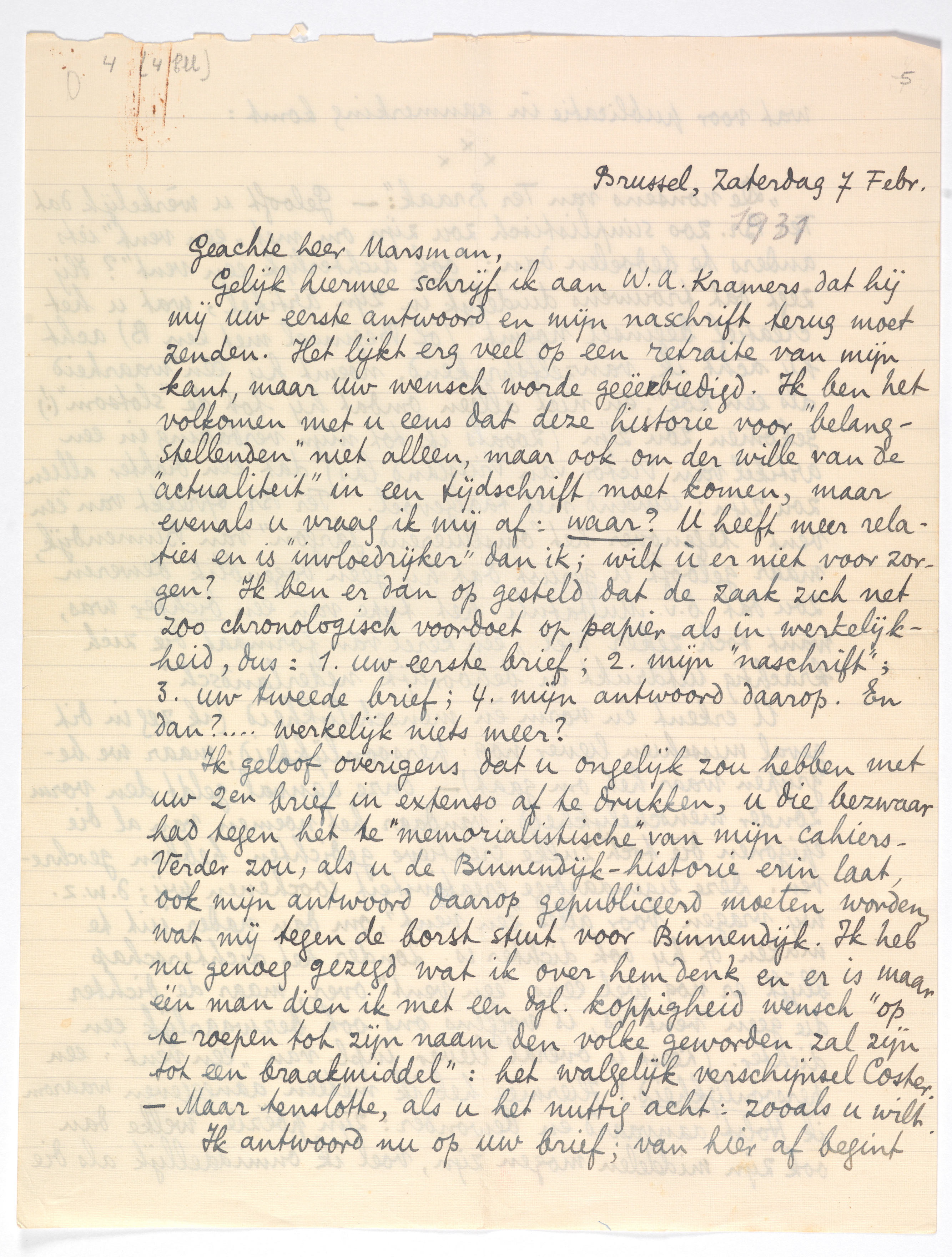 Gelijk hiermee schrijf ik aan W.A. Kramers dat hij mij uw eerste antwoord en mijn naschrift terug moet zenden. Het lijkt erg veel op een retraite van mijn kant, maar uw wensch worde geëerbiedigd. Ik ben het volkomen met u eens dat deze historie voor ‘belangstellenden’ niet alleen, maar ook om der wille van de ‘actualiteit’ in een tijdschrift moet komen, maar evenals u vraag ik mij af: waar? U heeft meer relaties en is ‘invloedrijker’ dan ik; wilt ù er niet voor zorgen? Ik ben er dan op gesteld dat de zaak zich net zoo chronologisch voordoet op papier als in werkelijkheid, dus: 1. uw eerste brief; 2. mijn ‘naschrift’; 3. uw tweede brief; 4. mijn antwoord daarop. En dan?.... werkelijk niets meer?
