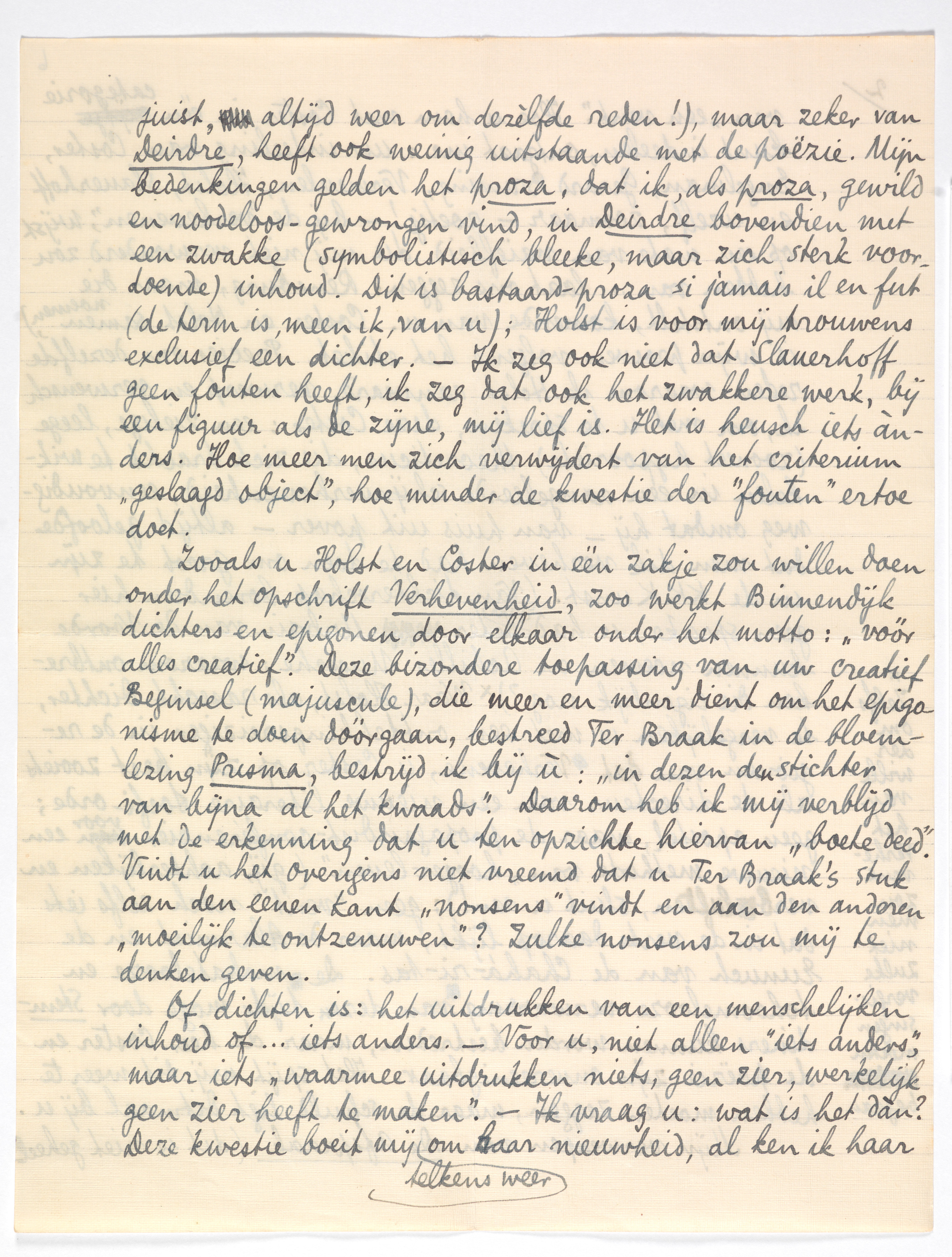 Mijn verwerpen van De Afspraak (dit is niet geheel juist, altijd weer om dezèlfde reden!), maar zeker van Deirdre, heeft ook weinig uitstaande met de poëzie. Mijn bedenkingen gelden het proza, dat ik, als proza, gewild en noodeloos-gewrongen vind, in Deirde boven-dien met een zwakke (symbolistisch bleeke, maar zich sterk voordoende) inhoud. Dit is bastaard-proza si jamais il en fut (de term is, meen ik, van u); Holst is voor mij trouwens exclusief een dichter. - Ik zeg ook niet dat Slauerhoff geen fouten heeft, ik zeg dat ook het zwakkere werk, bij een figuur als de zijne, mij lief is. Het is heusch iets ànders. Hoe meer men zich verwijdert van het criterium ‘geslaagd object’, hoe minder de kwestie der ‘fouten’ ertoe doet.