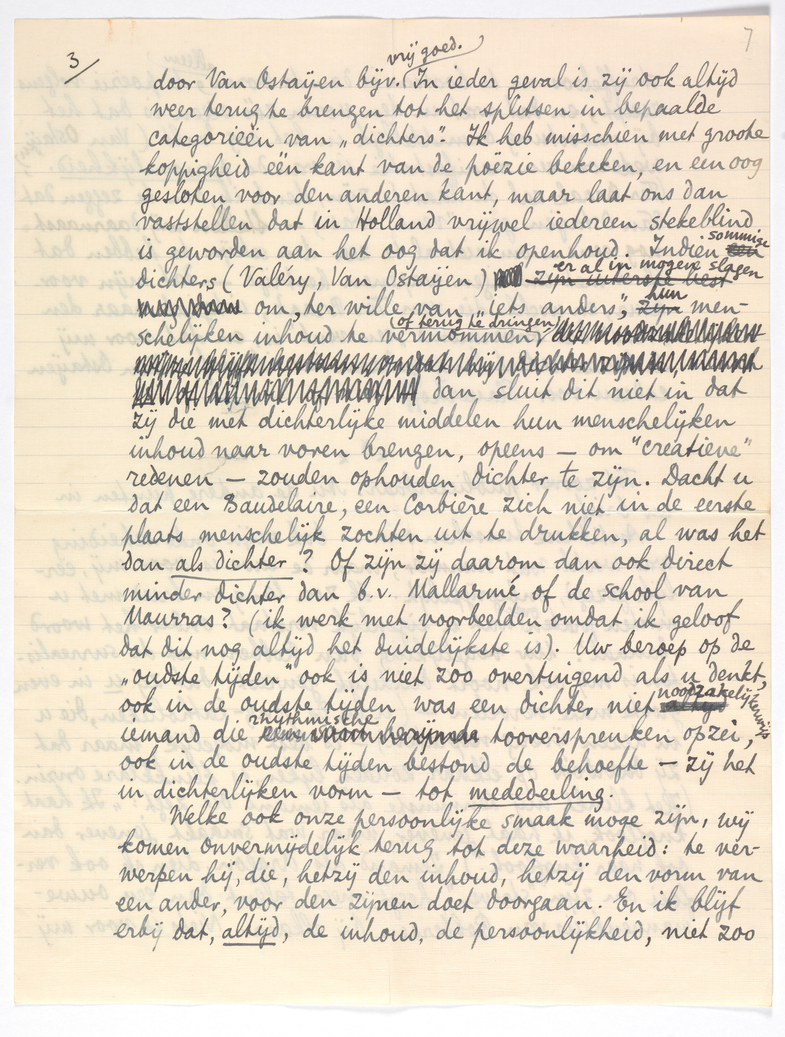 Of dichten is: het uitdrukken van een menschelijken inhoud of... iets anders. - Voor u, niet alleen ‘iets anders’, maar iets ‘waarmee uitdrukken niets, geen zier, werkelijk geen zier heeft te maken’. - Ik vraag u: wat is het dàn? Deze kwestie boeit mij telkens weer om haar nieuwheid, al ken ik haar door Van Ostaijen bijv. vrij goed. In ieder geval is zij ook altijd weer terug te brengen tot het splitsen in bepaalde categorieën van ‘dichters’. Ik heb misschien met groote koppigheid één kant van de poëzie bekeken, en een oog gesloten voor den anderen kant, maar laat ons dan vaststellen dat in Holland vrijwel iedereen stekeblind is geworden aan het oog dat ik openhoud. Indien sommige dichters (Valéry, Van Ostaijen) er al in mogen slagen om, ter wille van ‘iets anders’, hun menschelijken inhoud te vermommen of terug te dringen, dan sluit dit niet in dat zij die met dichterlijke middelen hun menschelijken inhoud naar voren brengen, opeens - om ‘creatieve’ redenen - zouden ophouden dichter te zijn. Dacht u dat een Baudelaire, een Corbière zich niet in de eerste plaats menschelijk zochten uit te drukken, al was het dan als dichter? Of zijn zij daarom dan ook direct minder dichter dan b.v. Mallarmé of de school van Maurras? (ik werk met voorbeelden omdat ik geloof dat dit nog altijd het duidelijkste is). Uw beroep op de ‘oudste tijden’ ook is niet zoo overtuigend als u denkt, ook in de oudste tijden was een dichter niet noodzakelijkerwijs iemand die rhytmische tooverspreuken opzei, ook in de oudste tijden bestond de behoefte - zij het in dichterlijken vorm - tot mededeeling.