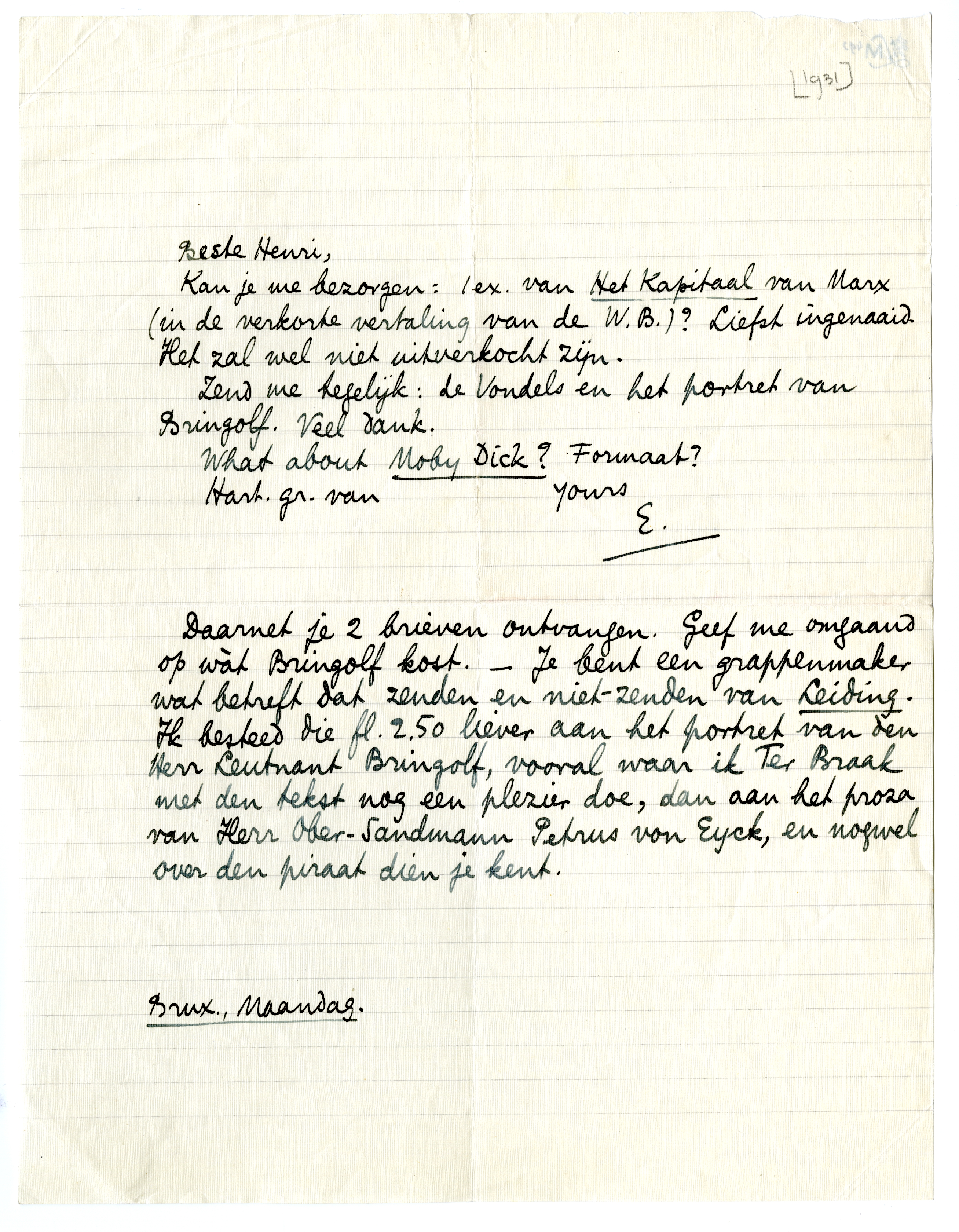 Daarnet je 2 brieven ontvangen. Geef me omgaand op wàt Bringolf kost. - Je bent een grappenmaker wat betreft dat zenden en nietzenden van Leiding. Ik besteed die fl.2.50 liever aan het portret van den Herr Leutnant Bringolf, vooral waar ik Ter Braak met den tekst nog een plezier doe, dan aan het proza van Herr Ober-Sandmann Petrus von Eyck, en nogwel over den piraat dien je kent.1543