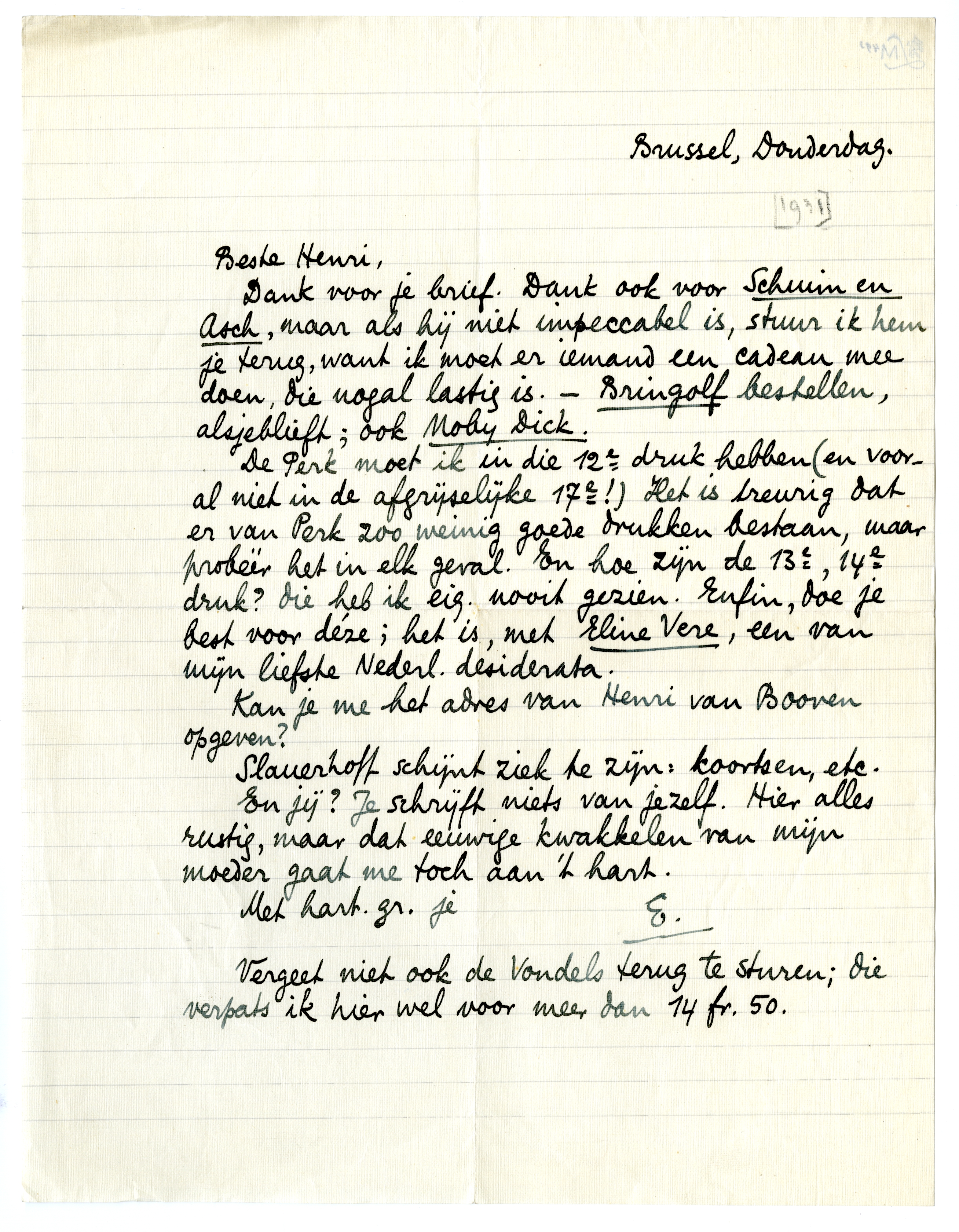 Dank voor je brief. Dank ook voor Schuim en Asch, maar als hij niet impeccabel is, stuur ik hem je terug, want ik moet er iemand een cadeau mee doen, die nogal lastig is. - Bringolf bestellen, alsjeblieft; ook Moby Dick.