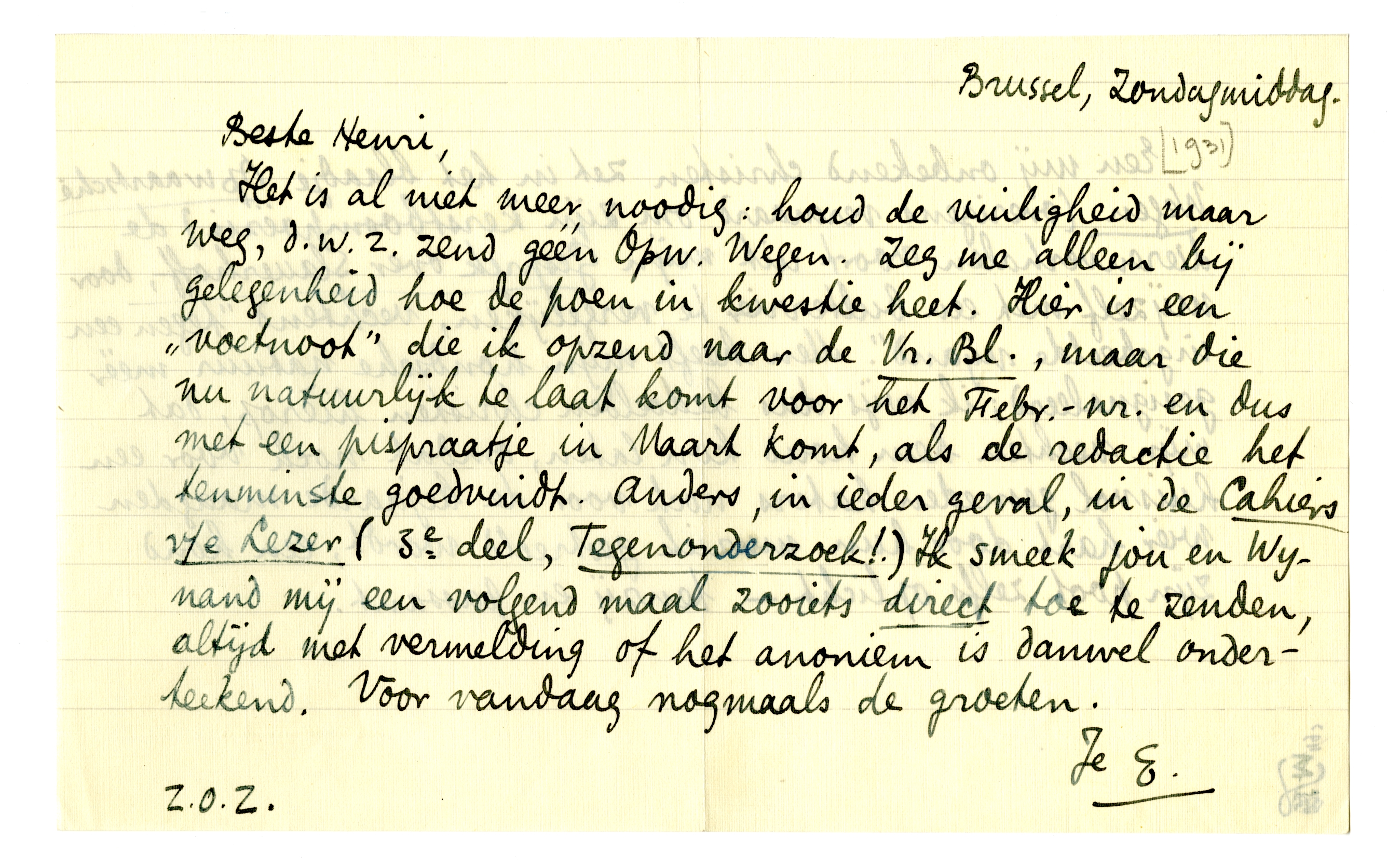 Het is al niet meer noodig: houd de vuiligheid maar weg, d.w.z. zend géén Opw. Wegen. Zeg me alleen bij gelegenheid hoe de poen in kwestie heet. Hier is een ‘voetnoot’ die ik opzend naar de Vr. Bl.,1562 maar die nu natuurlijk te laat komt voor het Febr.-nr. en dus met een pispraatje in Maart komt, als de redactie het tenminste goedvindt. Anders, in ieder geval, in de Cahiers v/e Lezer (3e deel, Tegenonderzoek!.) Ik smeek jou en Wynand mij een volgend maal zooiets direct toe te zenden, altijd met vermelding of het anoniem is danwel onderteekend. Voor vandaag nogmaals de groeten.