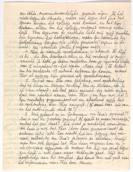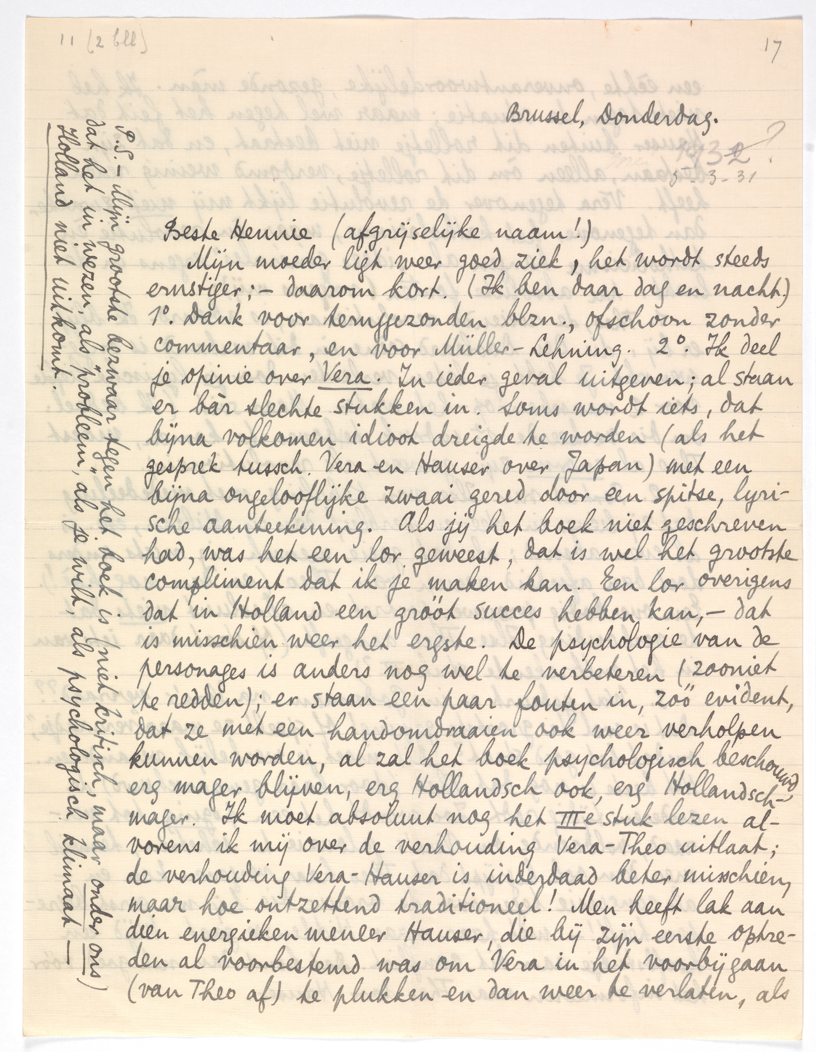 Mijn moeder ligt weer goed ziek, het wordt steeds ernstiger; - daarom kort. (Ik ben daar dag en nacht.) 1o. Dank voor teruggezonden blzn., ofschoon zonder commentaar, en voor Müller-Lehning.1599 2o. Ik deel je opinie over Vera. In ieder geval uitgeven; al staan er bàr slechte stukken in. Soms wordt iets, dat bijna volkomen idioot dreigde te worden (als het gesprek tussch. Vera en Hauser over Japan) met een bijna ongelooflijke zwaai gered door een spitse, lyrische aanteekening. Als jij het boek niet geschreven had, was het een lor geweest, dat is wel het grootste compliment dat ik je maken kan. Een lor overigens dat in Holland een gróót succes hebben kan, - dat is misschien weer het ergste. De psychologie van de personages is anders nog wel te verbeteren (zooniet te redden); er staan een paar fouten in, zóó evident, dat ze met een handomdraaien ook weer verholpen kunnen worden, al zal het boek psychologisch beschouwd erg mager blijven, erg Hollandsch ook, erg Hollandsch-mager. Ik moet absoluut nog het IIIe stuk lezen alvorens ik mij over de verhouding Vera-Theo uitlaat; de verhouding Vera-Hauser is inderdaad beter misschien, maar hoe ontzettend traditioneel! Men heeft lak aan dien energieken meneer Hauser, die bij zijn eerste optreden al voorbestemd was om Vera in het voorbijgaan (van Theo af) te plukken en dan weer te verlaten, als een èchte, onverantwoordelijke, gezonde màn. Ik heb niets tegen de situatie; maar wel tegen het feit dat Hauser buiten dit rolletje niet bestaat, en dat zijn bestaan, alleen òm dit rolletje, verdomd weinig reden heeft. Vera tegenover de revolutie lijkt mij niet zwakker dan tegenover het katholicisme, maar èn revolutie èn katholicisme hangen als ‘idées générales’ ergens in de lucht. Nu absolute fouten (volgens mij):
