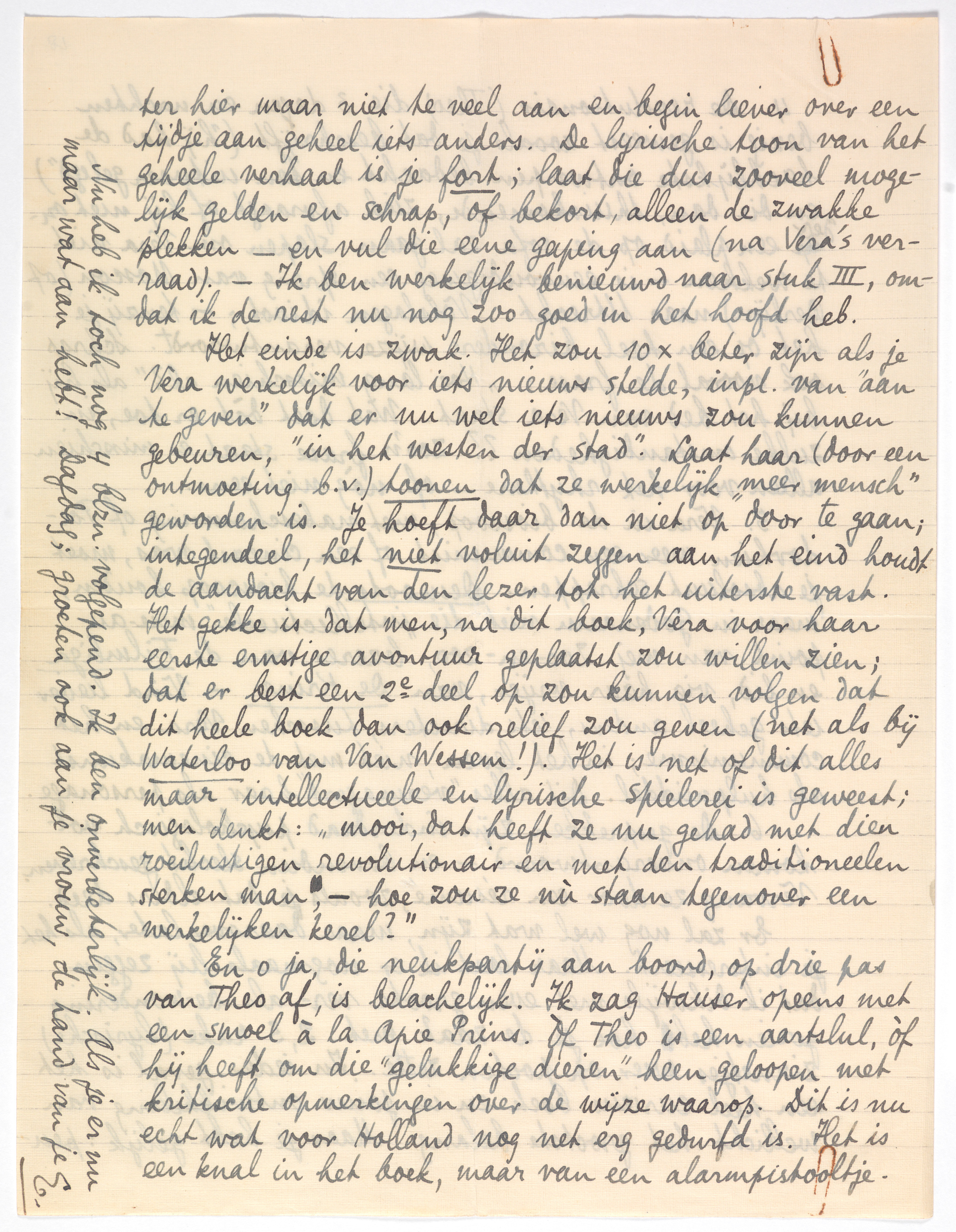Het einde is zwak. Het zou 10 × beter zijn als je Vera werkelijk voor iets nieuws stelde, inpl. van ‘aan te geven’ dat er nu wel iets nieuws zou kunnen gebeuren, ‘in het westen der stad’. Laat haar (door een ontmoeting b.v.) toonen dat ze werkelijk ‘meer mensch’ geworden is. Je hoeft daar dan niet op door te gaan; integendeel, het niet voluit zeggen aan het eind houdt de aandacht van den lezer tot het uiterste vast. Het gekke is dat men, na dit boek, Vera voor haar eerste ernstige avontuur geplaatst zou willen zien; dat er best een 2e deel op zou kunnen volgen dat dit heele boek dan ook relief zou geven (net als bij Waterloo van Van Wessem!). Het is net of dit alles maar intellectueele en lyrische spielerei is geweest; men denkt: ‘mooi, dat heeft ze nu gehad met dien roeilustigen revolutionair en met den traditioneelen sterken man, - hoe zou ze nù staan tegenover een werkelijken kerel?’
